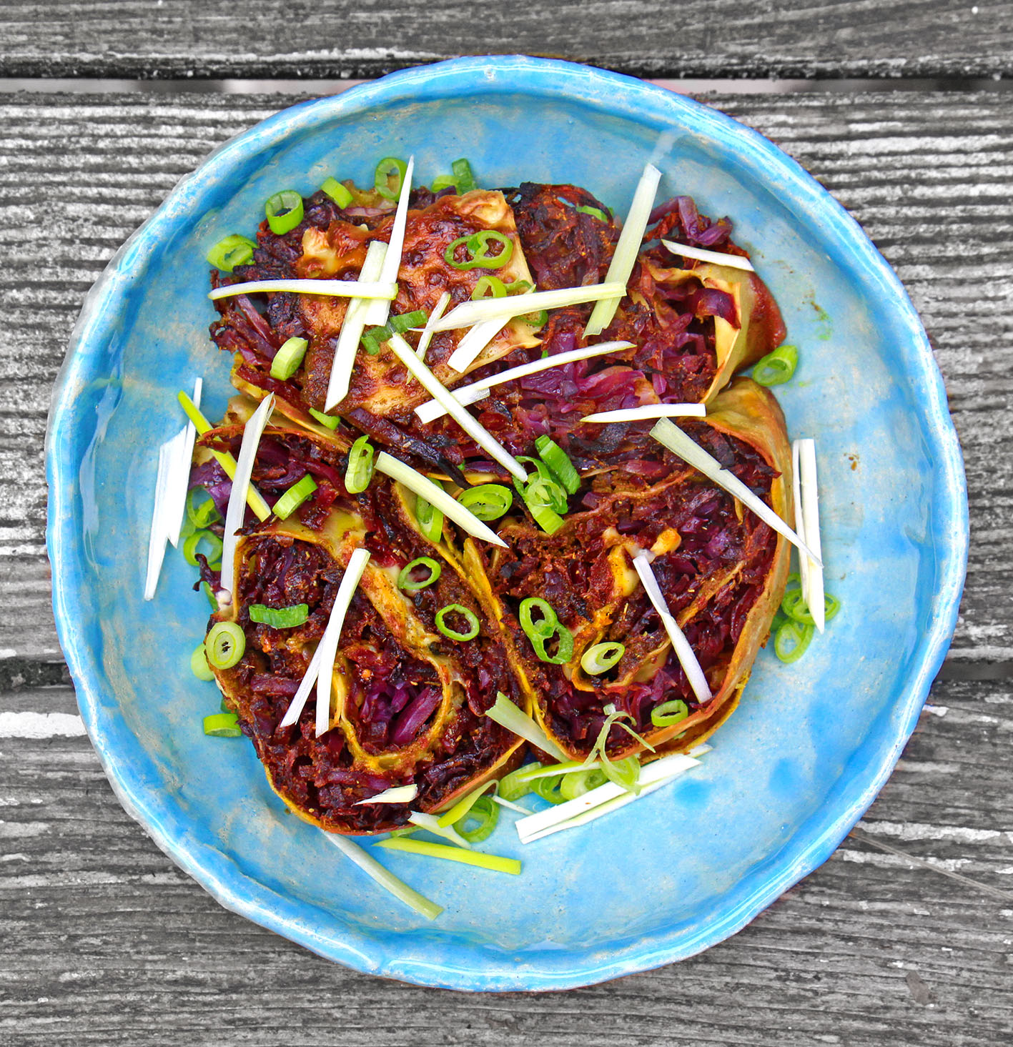 Für Zwei Hungrige: 1 kleinen roten Spitzkohl fein schneiden und mit 1 TL Salz und 50ml Cranberrysaft ca. 15 Minuten dünsten. 1 Zwiebel, ein daumengroßes Stück Ingwer und ein etwas halb so großes Stück Kurkuma mit 1/2 TL Salz sowie je 1 EL Honig, Sesamöl und Curry (Schärfe nach Geschmack) zu einer feinen Paste verarbeiten. Nudelteig* (etwa in der Größe eines Backblechs) dünn ausrollen (oder fertigen Teig z.B. Nudelteig von Buerger nehmen). Die Teigplatte mit der Paste bestreichen. Das Kraut darauf verteilen und mit 200g Blauschimmelkäse belegen. Locker von der kurzen Seite aufrollen und in 6–8 dicke Scheiben schneiden. Diese (dicht an dicht) in eine Auflaufform setzen, mit ca. 2 EL Öl bedecken und bei 180° im Backofen ca. 30 Minuten garen.