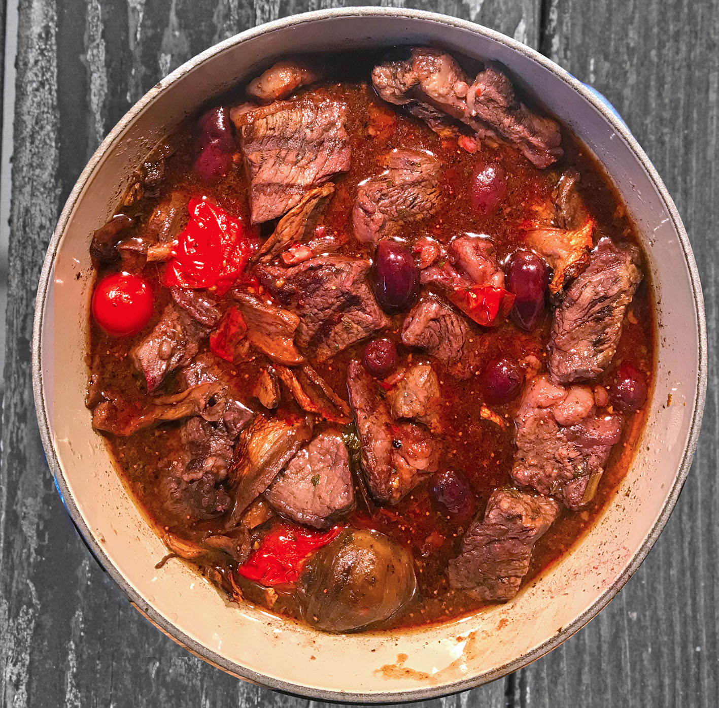 4–6 Portionen: 25g getrocknete Steinpilze einweichen (mind. 1 Stunde). 800g Rinder-Entrecote in große Würfel (ca. 4×4 cm) schneiden, und portionsweise in einem Bräter anbraten. 1 rosa Zwiebel grob würfeln, ebenfalls anbraten und mit ca. 300ml Primitivo (rot) ablöschen. Den Backofen auf 80° vorheizen. Das Fleisch, 100g Kalamata-Oliven ohne Stein, 125g Cocktail-Tomaten, die Pilze und 1 geviertelte Feige dazu geben. Mit 2-3 Zweigen Majoran, 1 Knoblauchzehe, 5 Wachholderbeeren, 1TL Kubebenpfeffer (gemörsert) sowie 1TL Schokoladensalz würzen. Den restlichen Wein aufgießen, den Deckel des Bräters schließen und für ca. 2 Stunden im Ofen bei 80° schmoren. Das Fleisch herausnehmen und warm stellen. Die Wacholderbeeren herausfischen und die Soße etwas einkochen, dann mit dem Zauberstab pürieren und das Fleisch wieder hinein geben. Mit frischer Pasta servieren.