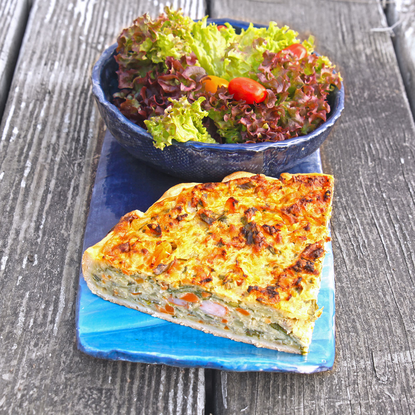 2 große Kohlrabi und 1 Möhre schälen und grob raspeln. 4 Eier, 200g Bergkäse (gerieben) und 100g Frischkäse zu einer homogenen Masse rühren. Die Masse auf den Teig geben und 200g Garnelen (verzehrfertig) verteilen und etwas tiefer in den Teig drücken. Ca. 40 Minuten backen.
