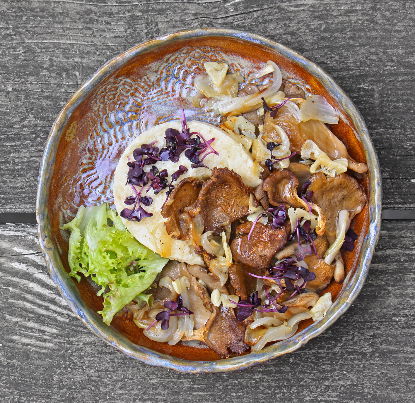 Für 2 als Hauptgericht. Je 250g Pastinaken und Knollensellerie schälen, in Stücke schneiden und in 125ml Kochsahne weich kochen – 25g Butter dazugeben und stampfen. 1 rosa Zwiebel (sind etwas süsser) in Ringe und 2 Koblauchzehen in dünne Scheiben schneiden. 600g Austernpilze putzen. Die Zwiebeln in einer großen flachen Pfanne anbraten die Pilze und den Knoblauch hineingeben und ca. 5 Minuten schmoren. Die gebratenen Pilze auf dem Püree anrichten und mit Salat servieren.