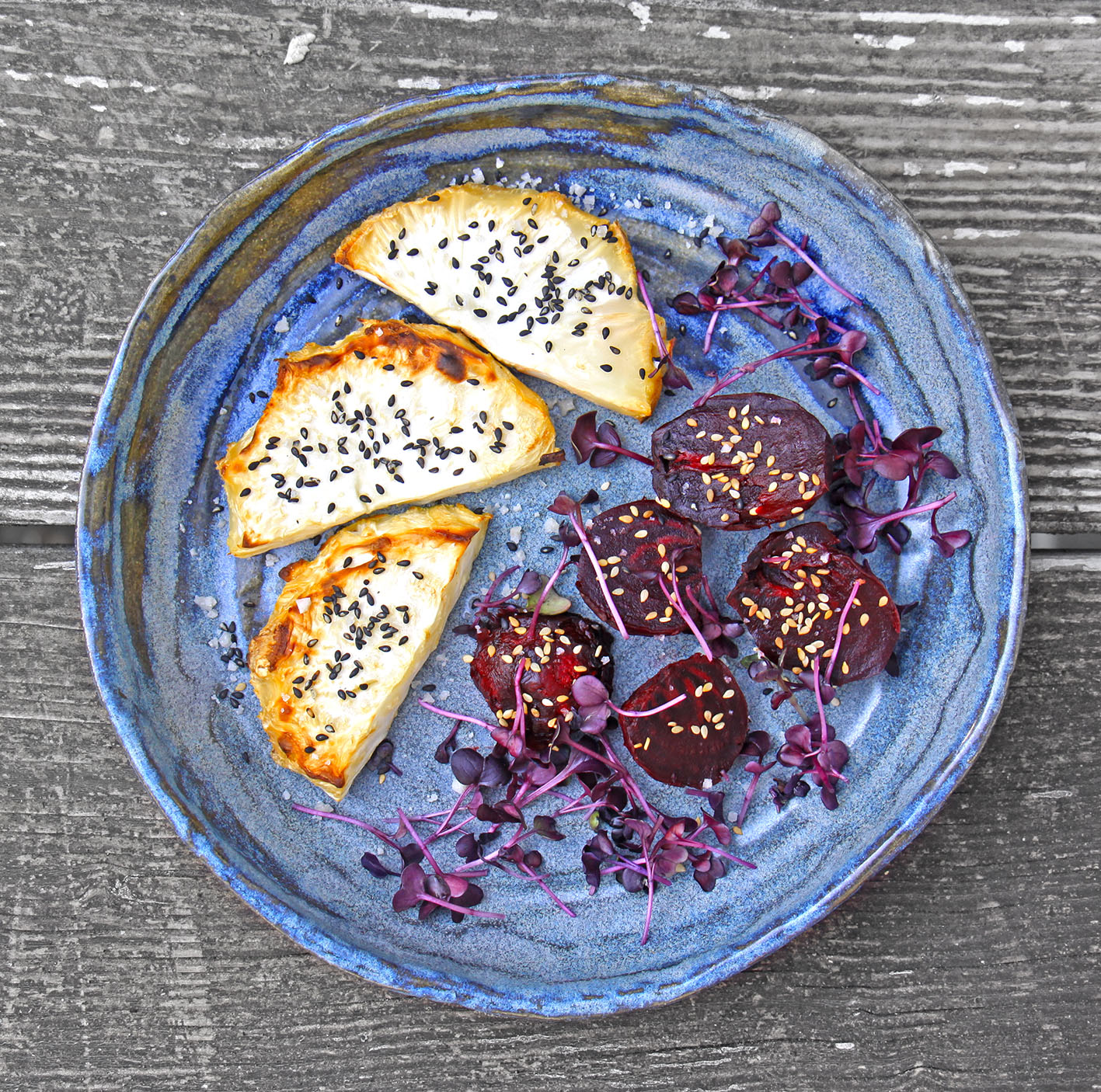 Für 4 Portionen: 1–2 Bete, 1/2 Sellerie, 1 Möhre oder 1/4 Steckrüben schälen – in ca. 1,5 cm dicke Scheiben schneiden (wenn die Bete-Knollen sehr klein sind, vierteln). Bei 180° im Backofen oder auf dem Grill getrennt (als “Schranke” Backpapier verwenden) voneinander (damit die Rote Bete nicht alles verfärbt) 15–20 Minuten grillen – 3 EL Olivenöl mit dem Saft 1 Zitrone und einer Prise Salz sämig rühren und über das heiße Gemüse geben, mit geröstetem Sesam (für helles Gemüse eignet sich auch schwarzer Sesam sehr gut) bestreuen. Kalt oder lauwarm mit Blattsalaten oder als Beilage zu Fisch oder Fleisch essen.