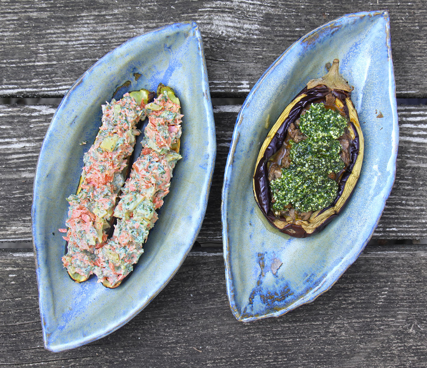 Für Zwei: 2 Zucchini (ca. 25 cm lang/ø 7 cm) halbieren und die Kerne herausschaben. 300g gewürfelten Lachs (roh und/oder geräuchert) mit 150g Ricotta, 1/2 Bund fein gehacktem Dill und 1 Ei mischen – in die Zucchinihälften füllen, dabei die Füllung gut zusammendrücken – im Backofen bei 180° in einer Auflaufform oder im tiefen Backblech oder auf dem Grill ca. 20 Minuten garen.