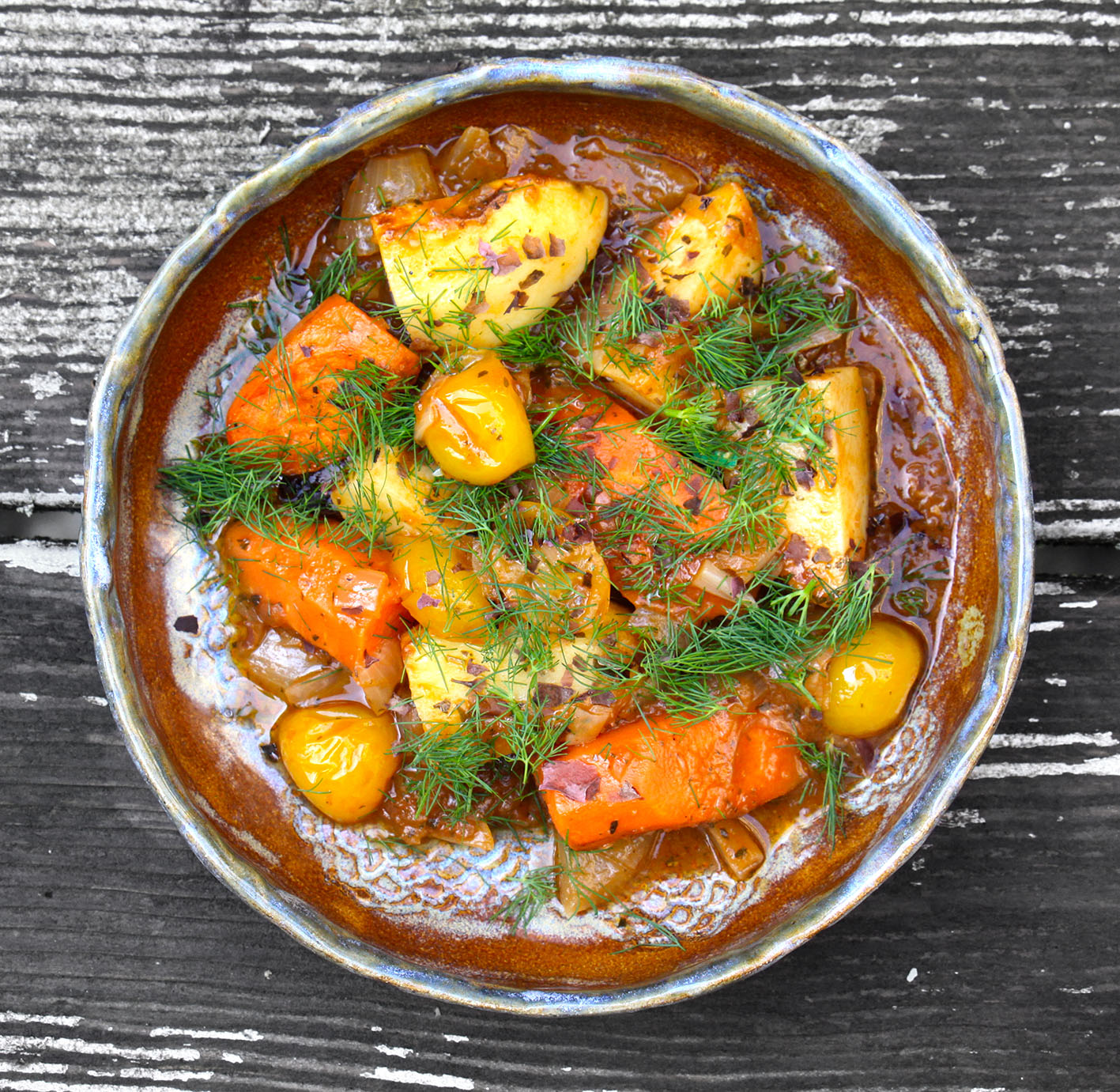 Für 2: 300g Möhren und 300g Kartoffeln putzen und in große Stücke schneiden. 2–3 Eier-Tomaten häuten und würfeln (oder 200g Dosentomaten/stückig). 1 Zwiebel fein gehackt anbraten – Masala-Tandoori-Mischung (Kreuzkümmel, Mangopulver, Granatapfelpulver, Koriander-Samen (gemahlen), schwarzen Senf, Cayenne-Pfeffer) dazugeben und mit den Tomatenstücken ablöschen. Kartoffeln und Möhren in die Soße legen und noch ca. 20 Minuten mit Deckel köcheln, bis die Kartoffeln gar sind. Oder die Tomaten-Gewürz-Soße in eine Auflaufform geben, das Gemüse hineinlegen und bei 180° ca. 20 Minuten garen. Mit frischem Knoblauch und/oder Möhren-Grün (alternativ Koriander oder Dill) bestreut servieren.