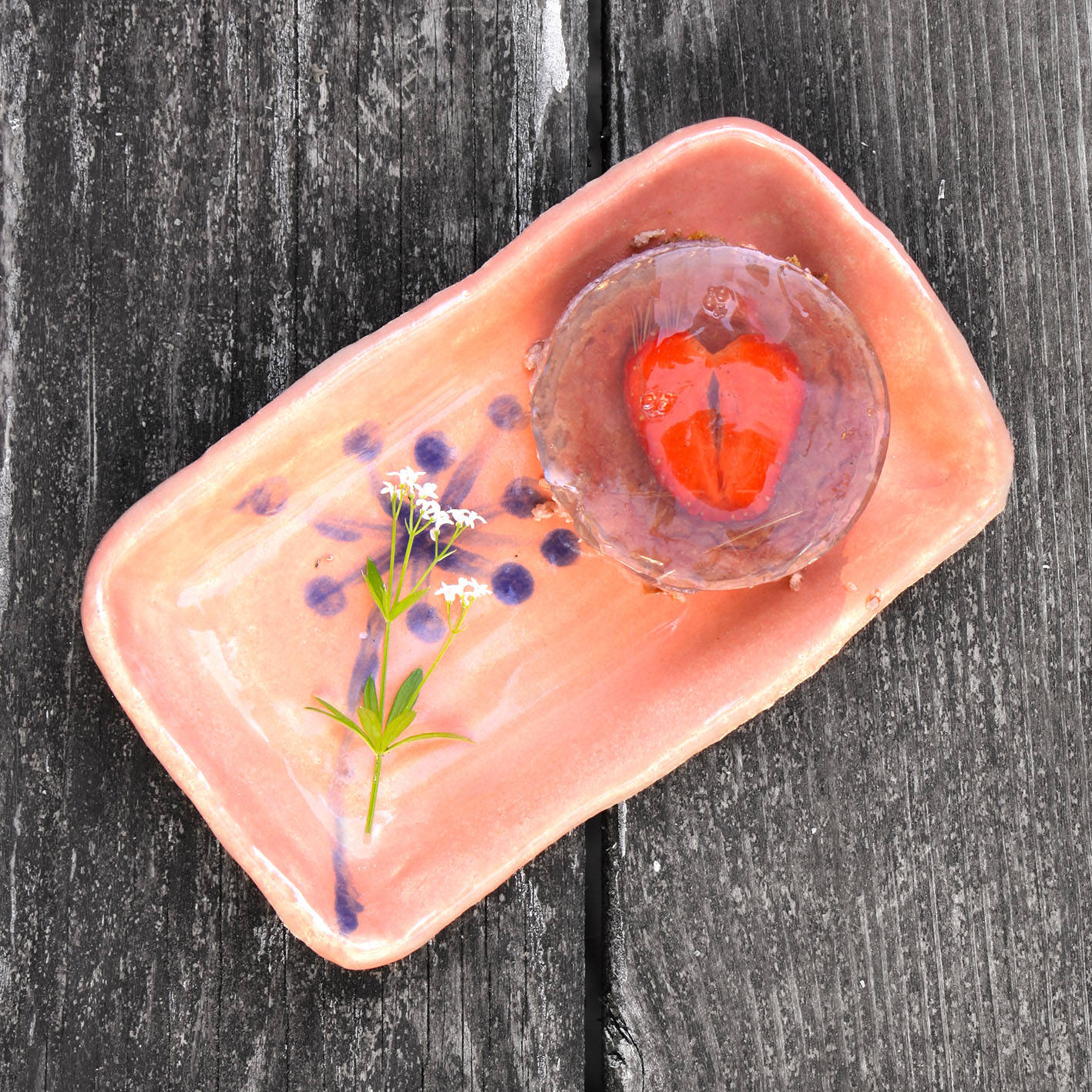 Den Waldmeistersirup abseien und 50ml davon mit 100ml Prosecco und 1 TL (gestrichen) Agartine 2 Minuten kochen. Abkühlen lassen bis die Masse gerade noch nicht geliert (also noch flüssig ist). Von 3 großen Erdbeeren aus der Mitte je 2 Scheiben herausschneiden und jeweils eine Scheibe auf ein Törtchen legen und das Sirup-Gelee verteilen. Fest werden lassen und die Törtchen mit einem Messer aus den Anrichteringen lösen.