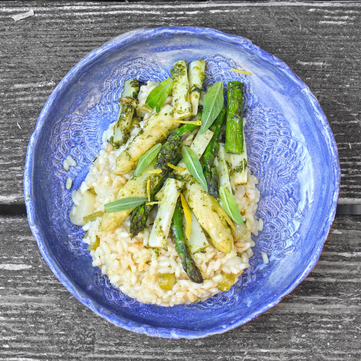 Für 2 Risotto-Freunde: 500g Spargel (grün und/oder weiß) nach Bedarf schälen. Die Spitzen abschneiden kurz in etwas Butter anbraten und beiseite legen – den Rest in ca. 1cm dicke Scheiben schneiden und diese im Risotto-Topf in Olivenöl ebenfalls kurz anbraten – 160g Risottoreis (z.B. Arborio) dazugeben und nach und nach 400ml Flüssigkeit zugeben (nach Geschmack Weißwein mit Gemüsebrühe mischen). Dabei immer wieder umrühren. Nach ca. 15 Minuten die Spargelspitzen, 100g geriebenen Mozarella (oder den Mozarella in kleine Würfel schneiden) sowie 1/2 Bund Basilikum gehackt unterrühren. Mit Zitronenzesten, Salz und Pfeffer abschmecken.