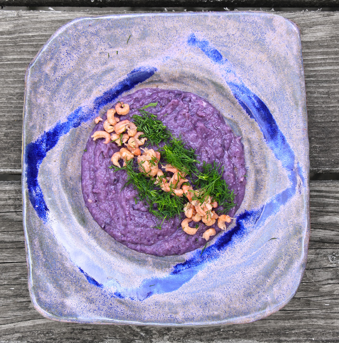 Für Zwei Suppenfreunde: 400g Lila Kartoffeln (ganz / mit Schale) und 1 Fenchelknolle (in Stücken) bei 170 °C im Backofen 15 Minuten lang garen – die Kartoffeln schälen und halbieren bzw. in Stücke schneiden (je nach Größe). Gemüsewürfel mit 0,5l Brühe (Hühnerbrühe oder Gemüsebrühe) aufgießen und fein pürieren, abschmecken. 150g Nordseekrabben zusammen mit 4 EL gehackten Dillspitzen in der Mitte der Teller anrichten.