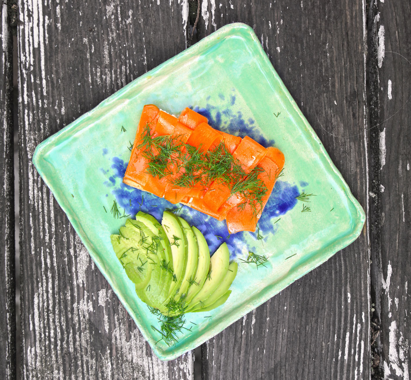 2 große Möhren, mit einem Sparschäler in dünne Streifen hobeln. In einen Topf mit 250ml Wasser und 1 TL Kalanamag-Salz (indisches Schwefelsalz) einen Dünsteinsatz legen und die Möhrenstreifen 1-2 Minuten dünsten – oder die Möhrenstreifen in einer Schale mit kochendem Wasser übergießen für 1 Minuten liegen lassen und dann wieder herausnehmen. Für die Marinade 1 EL Leinöl (Omega 3) mit 2 EL Sonnenblumenöl, 1 EL Reisessig, 1 EL Agavendicksaft, 1 TL Kalanamag-Salz und 1-2 Tropfen Liquid Smoke mischen. Noch heiße Möhren in Marinade legen. Mindestens 3 Std. und bis zu 2 Tage ziehen lassen im Kühlschrank (abdecken). Toast mit Sahnemeerrettich oder Meerrettich-Frischkäse bestreichen und Möhren darauf mit frischem Dill anrichten.