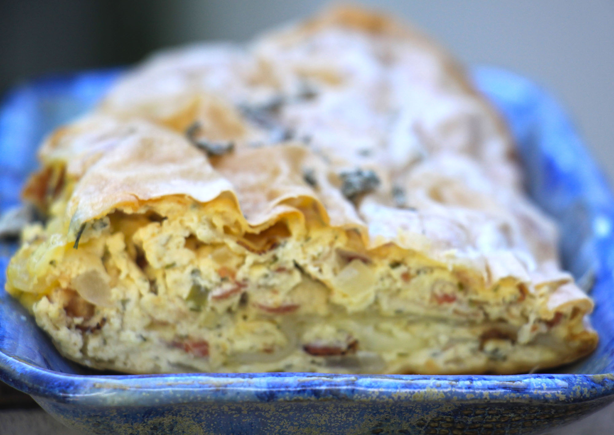 Für die Füllung: 1 Zwiebel und 100 Frühstücksspeck klein würfeln und (ohne weiteres Fett) zusammen anbraten bis die Zwiebeln glasig sind. 300g Kräuterfrischkäse, 2 Eier und 50g geriebenen Bergkäse gründlich mischen. Die Zwiebel-Speck-Masse unterrühren. Den Backofen auf 180° vorheizen. 50g Butter schmelzen. 2 Strudelblätter (Tante Fanny) bereit legen. Eines auf ein Blech mit Backpapier legen und mit Butter bestreichen, das zweite Blatt darauf legen. Dann die Füllung in die Mitte geben. Die Seiten einschlagen (damit nichts herausläuft) und die Teigplatte aufrollen (Naht nach unten) und mit Butter bestreichen. Den Strudel 25 Minuten backen und lauwarm vernaschen. Dazu passt ein knackiger Blattsalat.