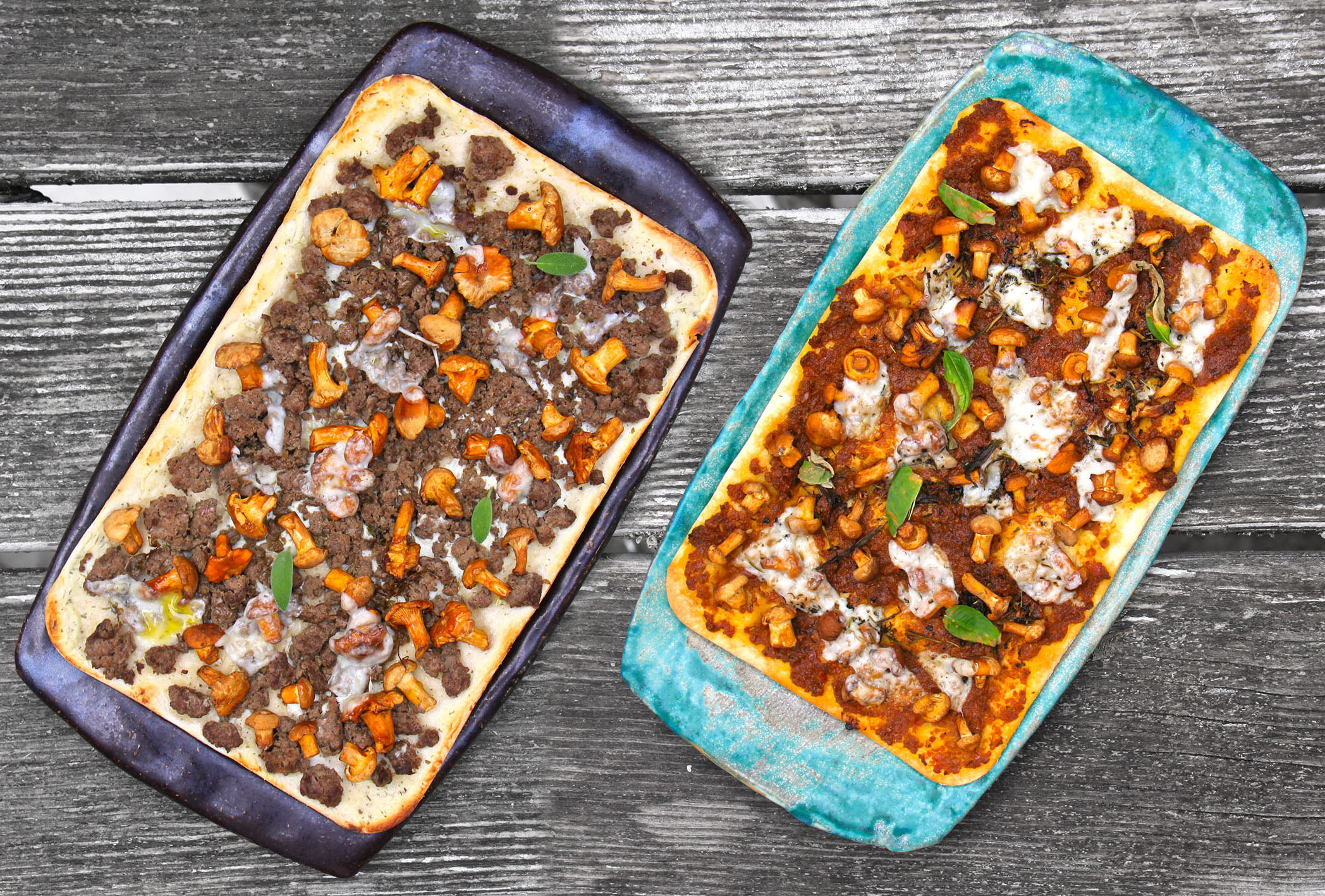 Für den Belag in zwei Varianten: 150g Hummus kräftig würzen (1 EL Ajvar, 1 TL Harissa oder scharfes Paprikapulver) und auf den Teig streichen. Oder 2 EL Kräuterfrischkäse auf den Teig streichen und 150g gebratenes Rehhack darauf verteilen. 400g Pfifferlinge (je nach Größe ganz oder halbiert) darauf verteilen. Einige Zweige Thymian fein hacken (oder andere frische Kräuter z.B. Salbei oder Koriander) und ebenso wie ca. 100g geriebenen Ziegenkäse (ihr könnt auch veganen Feta verwenden) darüberstreuen. Ca. 15 Minuten auf der untersten Schiene im vorgeheizten Backofen (Unterhitze) bei 200° backen.