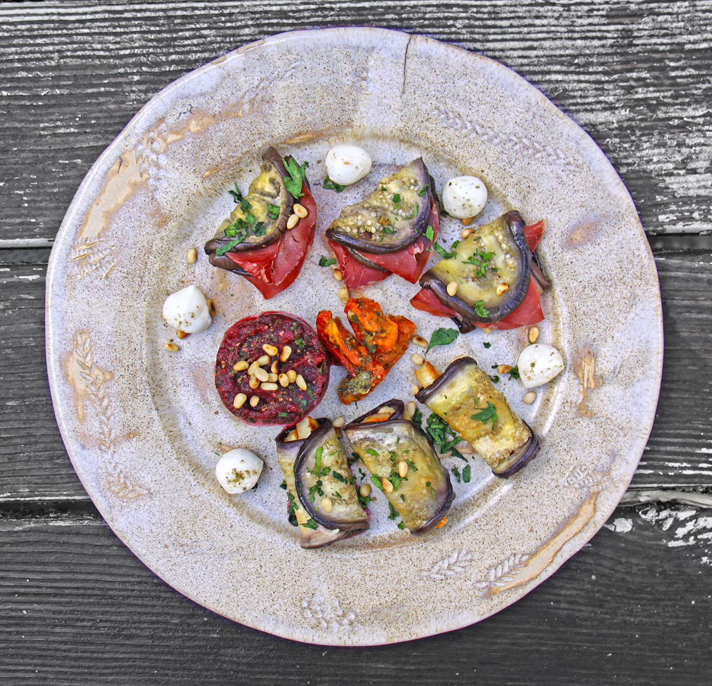 BETE-AUBERGINEN-TATAR > 2 kleinere Auberginen halbieren, einritzen und mit Rauchöl und geräuchertem Salz einreiben – ca. 30 Min bei 200° im Backofen garen. 2 Bete ebenfalls 30 Minuten im Backofen garen. Bete abkühlen lassen, schälen und pürieren. Das Fleisch aus den Auberginen schaben und mit dem Bete-Püree mischen. Mit Senf, Salz, Limette, Pfeffer und Kapern abschmecken.
