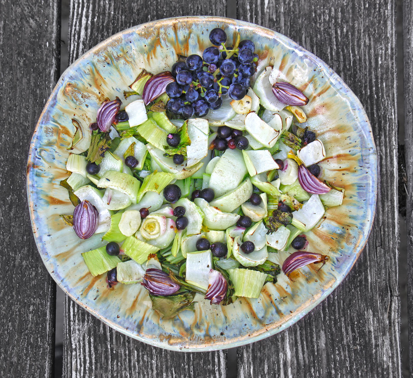 Für 2–4 Portionen – je nachdem was man noch dazu macht. 2 Pakchoi in Streifen schneiden und mit etwas Olivenöl anbraten. 200g frische blaue Weintrauben (alternativ Korinthen oder Cranberries) und 2–3 kleine rote Schalotten (geviertelt) dazugeben, kurz durchrühren und vom Herd nehmen. Mit Salz, Pfeffer, Koriander und Granatapfelpulver würzen. Kalt als Salat, im Wrap mit Hühnchenstreifen oder gegrilltem Halloumi genießen. Oder warm mit Bandnudeln. Das Gemüse schmeckt auch sehr gut mit Mangold.