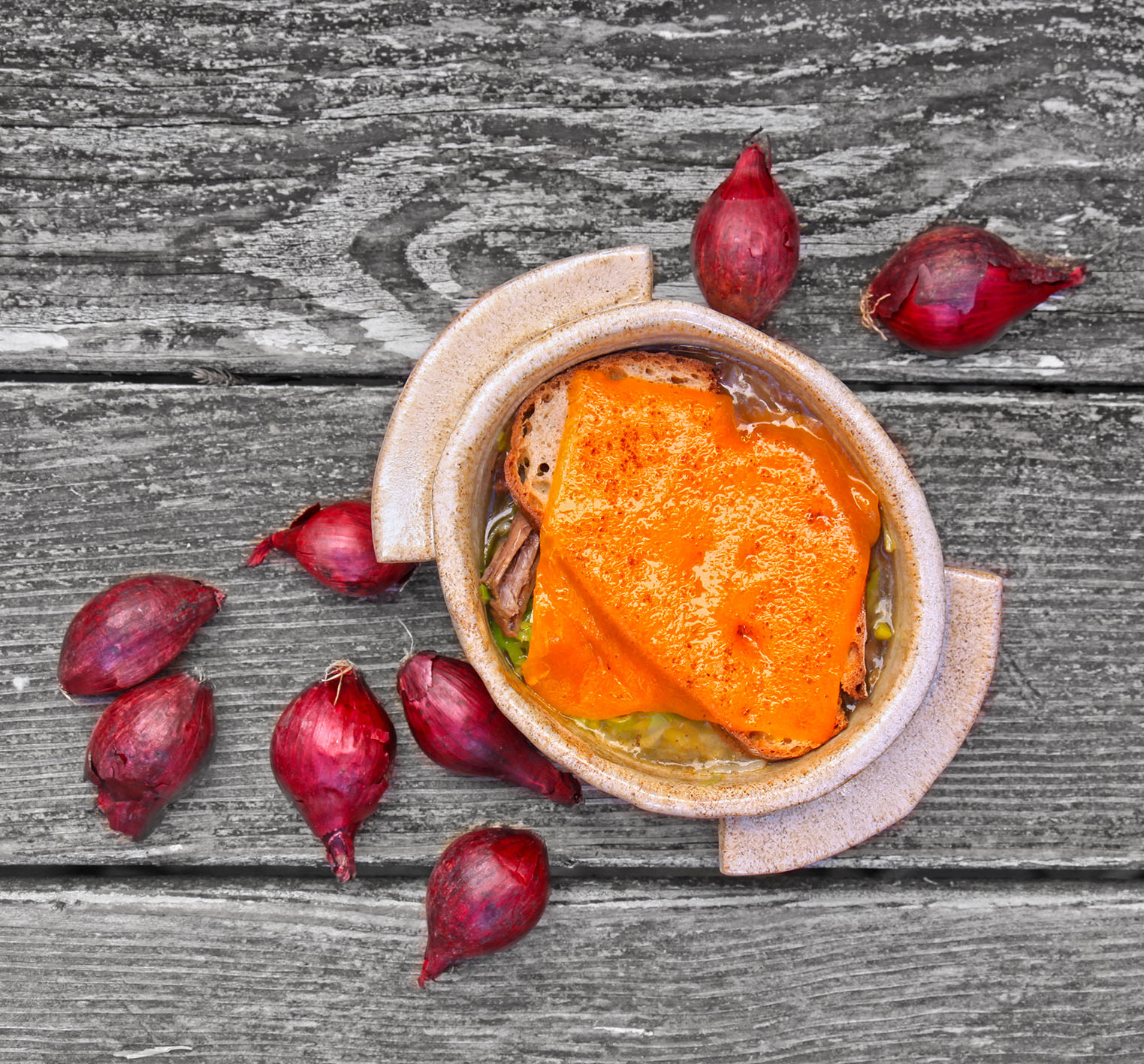 Für zwei Hungrige. 1/2 Stange Lauch und 3 kleine rote Zwiebeln in feine Ringe schneiden; in einem großen Topf in Olivenöl anbraten, mit 200ml Rosé ablöschen und noch 500 ml Rinderbrühe dazugeben – 10 Minuten köcheln. Mit Räuchersalz, Pfeffer und Kreuzkümmel würzen. In der Zwischenzeit pro Person 1 Scheibe Brot rösten und in große Stücke schneiden – 150g Cheddar reiben oder in etwas dickere Scheibe schneiden – die Suppe in ofenfeste Suppenschalen füllen – mit Brot und Käse bedecken und ca. 10 Minuten überbacken bis der Käse geschmolzen ist.