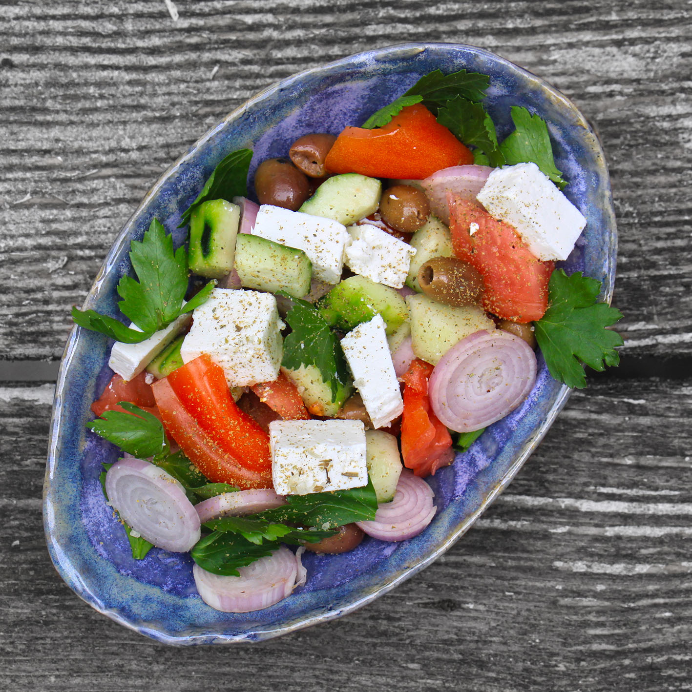 Für 2 Hungrige: Je 1 rote und gelbe Paprika (entkernt und evtl. geschält) in ca. 2×2 cm große Stücke schneiden. 1 rosa Zwiebel (oder 2 große Schalotte) in Ringe schneiden. 1 Salatgurke halbieren und die Kerne heraus schaben. Anschließend jede Hälfte nochmals halbieren und in ca. 2 cm. breite Stücke schneiden – 2 Ochsenherz-Tomaten vierteln die Kerne entfernen und in große Stücke schneiden. 100g violette Oliven (z.B. Kalamata, ohne Stein), 200g Feta (Schaf, Ziege oder Vegan/gewürfetlt) und eine handvoll glatte Petersilie (nur grob gehackt) mischen. Aus 1/2 TL Meersalz, 1/4 TL frisch gemörsertem grünen Pfeffer, dem Saft 1 Zitrone und 4 EL Olivenöl ein Dressing rühren und den Salat damit servieren.