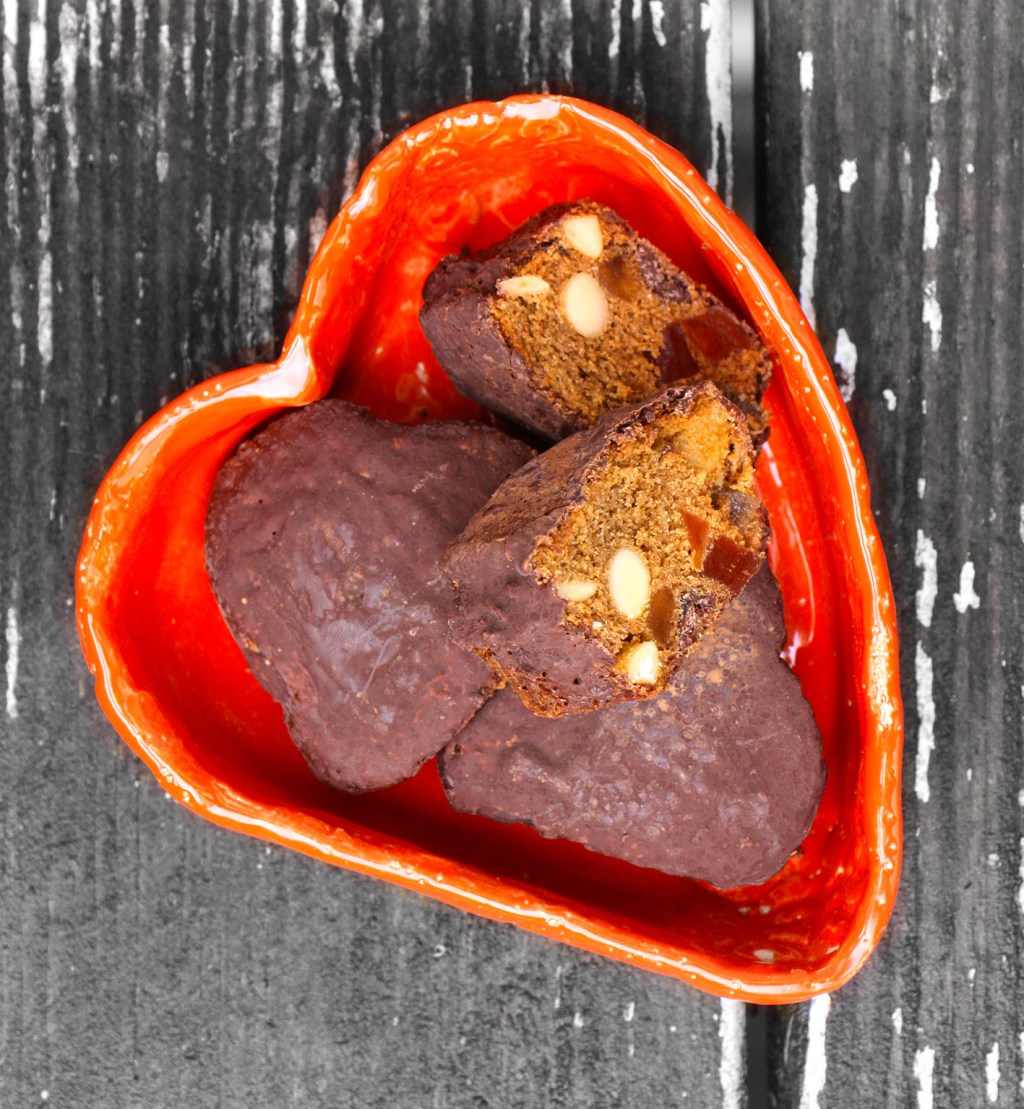 gewürfelt sowie 100 gehackte Nüsse dazugeben. Mit 20g Instant-Expresso sowie je einer Prise Nelke und Kardamom würzen. Die eingelegten Früchte mit der Masse mischen und alles für 40 Minuten bei 160° in einer flachen Form (im Bild aus 12 Herz-Backblech z.B. von Kaiser) backen. Noch warm 20 ml sehr starken Mokka und 20 ml Whisky mischen und auf die Lebkuchen träufeln. Mit 200g dunkler Schokolade überziehen. Mindestens 1 Tag durchziehen lassen.