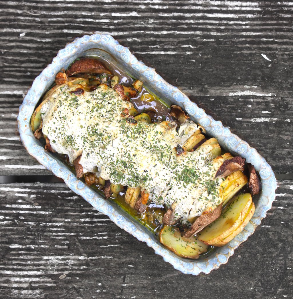 Für 2: Backofen auf 180° vorheizen. 2 große festkochende Kartoffeln (ca. 250g) waschen und in Scheiben schneiden. 200g griechischen Joghurt mit 1 Ei, 2 Zweigen gehackter Minze, 2 zerdrückten Knoblauchzehen und Salz gut verrühren. 150g Champignons ebenfalls in Scheiben schneiden. Kartoffel und Pilzscheiben abwechselnd in eine ofenfeste Form schichten mit der Joghurt-Sosse bedecken und mit 50g gehackte Walnüssen toppen. Mit 1EL Olivenöl bedecken und bei 180° ca. 45 Minuten backen (wenn er oben zu dunkel wird – mit Backpapier abdecken).