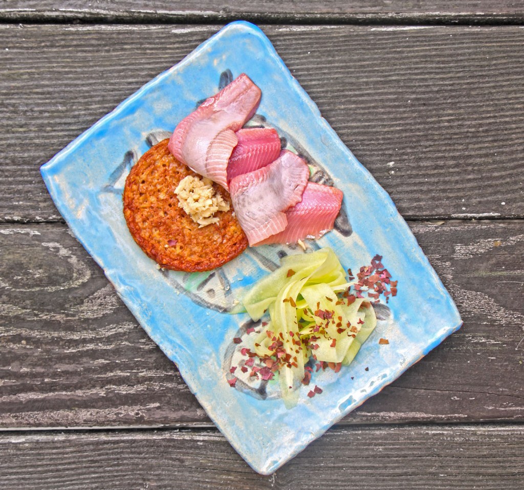 Für 6 Kartoffelplätzchen: 400g rohe festkochende Kartoffeln (geschält) in einer Küchenmaschine grob schreddern. Mit 200g Quark, 1 EL Speisestärke und 1 Ei gründlich mischen. Mit Salz, Pfeffer, etwas Muskat und 1 TL getrocknetem Schabzigerklee (Dill oder getrocknete Petersilie schmeckt natürlich auch sehr gut) würzen. Den Backofen auf 170° vorheizen. Zum Schluss noch 1/2 TL Natron unter die Kartoffelmasse rühren. Den Teig in eine 6er Silikon-Bun-Backform füllen (ø ca. 12 cm) und ca. 20 Minuten backen. Der Sherry-Matjes ist frisch vom Fischhändler meines Vertrauens. Pro Person braucht ihr 2–3 Filets. Dazu schmeckt ein leichter Gurkensalat – dazu von 1/2 geschälten Salatgurke mit einem Sparschäler von aussen beginnend dünne Scheiben abhobeln (die Kerne nicht verwenden). Im Bild mit einem Dressing aus je 1 EL Reisessig, Borretsch-Öl und Rotalgen-Flakes für die salzige Würze. Für den Meerrettich-Schmand 200g Schmand mit 2 EL frischem scharfen Meerrettich und 1 TL Zitrone mischen.
