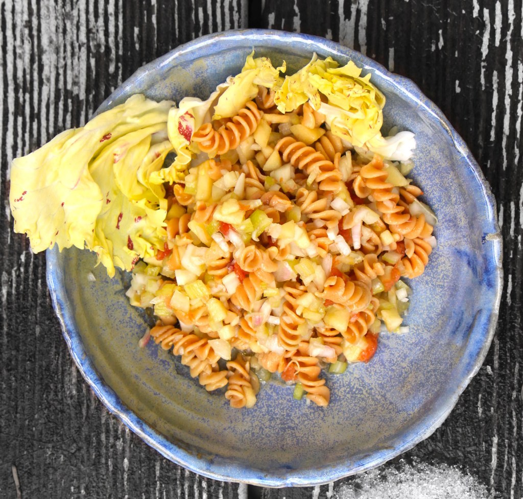 1/2 Staude Sellerie (mit einem scharfen Messer wie beim Rhabarber die äußere faserige Schicht der Stangen abziehen), 2 Tomaten (filetiert: Haut abziehen und Kerne entfernen), 1 Apfel (geschält) und 2 Knoblauchzehen sehr klein würfeln; je 4 El Reisessig, Honig und Wasser aufkochen und über das Gemüse geben – ziehen lassen. Schmeckt zu Fisch und Fleisch oder zum Dippen mit Weißbrot. Und es eignet sich bestens für Nudelsalat. Im Bild mit Linsen-Spirelli.