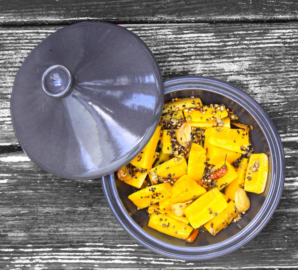 Für 2: 600g gemischtes Wurzelgemüse (Pastinake, Petersilienwurzel, Sellerie, Bete, Topinambur, Möhre, Süßkartoffel) waschen, schälen und in Stücke schneiden. In einer großen Tajine 1/2 Zwiebel (gewürfelt) anschwitzen – je 1 TL Senf– und Fenchelsamen sowie 1/2 TL Kümmel, mitbraten – das Gemüse sowie 2 bis 3 Knoblauchzehen, ein kleines Stück Kurkuma (in Scheiben) und 1 kleine rote Chili dazugeben. Mit Salz und Cayennepfeffer (nach Belieben) würzen. Deckel schließen und bei 200° für ca. 45 Minuten im Ofen schmoren. Schmeckt einfach so – oder mit Reis.