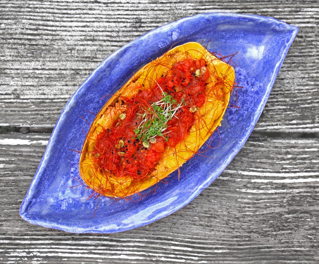 Deftiges Herbstlunch für Zwei: 1 Spaghetti-Kürbis halbieren und die Kerne entfernen. Mit Salz, Rosenpaprika und Kurkuma würzen und im Backofen bei 160° ca. 15 Minuten garen. In dieser Zeit in einer Pfanne 2 EL Ghee erhitzen, je 1 TL schwarze Senfsamen, Fenchelsamen, Kardamom (Kapsel aufbrechen und nur die kleinen Samen verwenden), 2 cm Ingwer, 2 Knoblauchzehen und 1 Zwiebel in Würfeln mit anbraten, mit 400g Tomatenwürfeln ablöschen. In die Kürbishälften geben und weitere 15 Minuten schmoren. Mit frischem Koriander bestreut direkt aus den Kürbishälften vernaschen.