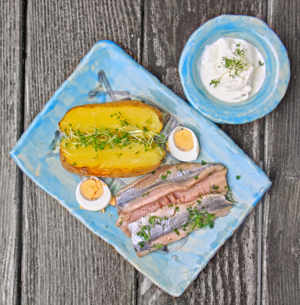 Für 2: In der Zwischenzeit 2 Eier hart kochen. 1 großes Beet Radieschen-Sprossen ernten (oder Kresse). Aus 150g Skyr, 250g Creme fraîche, 1/2 TL Salz sowie je 1 EL Zitronensaft und gehacktem Dill einem Dip anrühren. 4–6 Matjes-Filets „Schwedenart“ (mit roter Bete eingelegt) auf Tellern anrichten. Mit dem Ei, der Kartoffel und dem Dip vernaschen.
