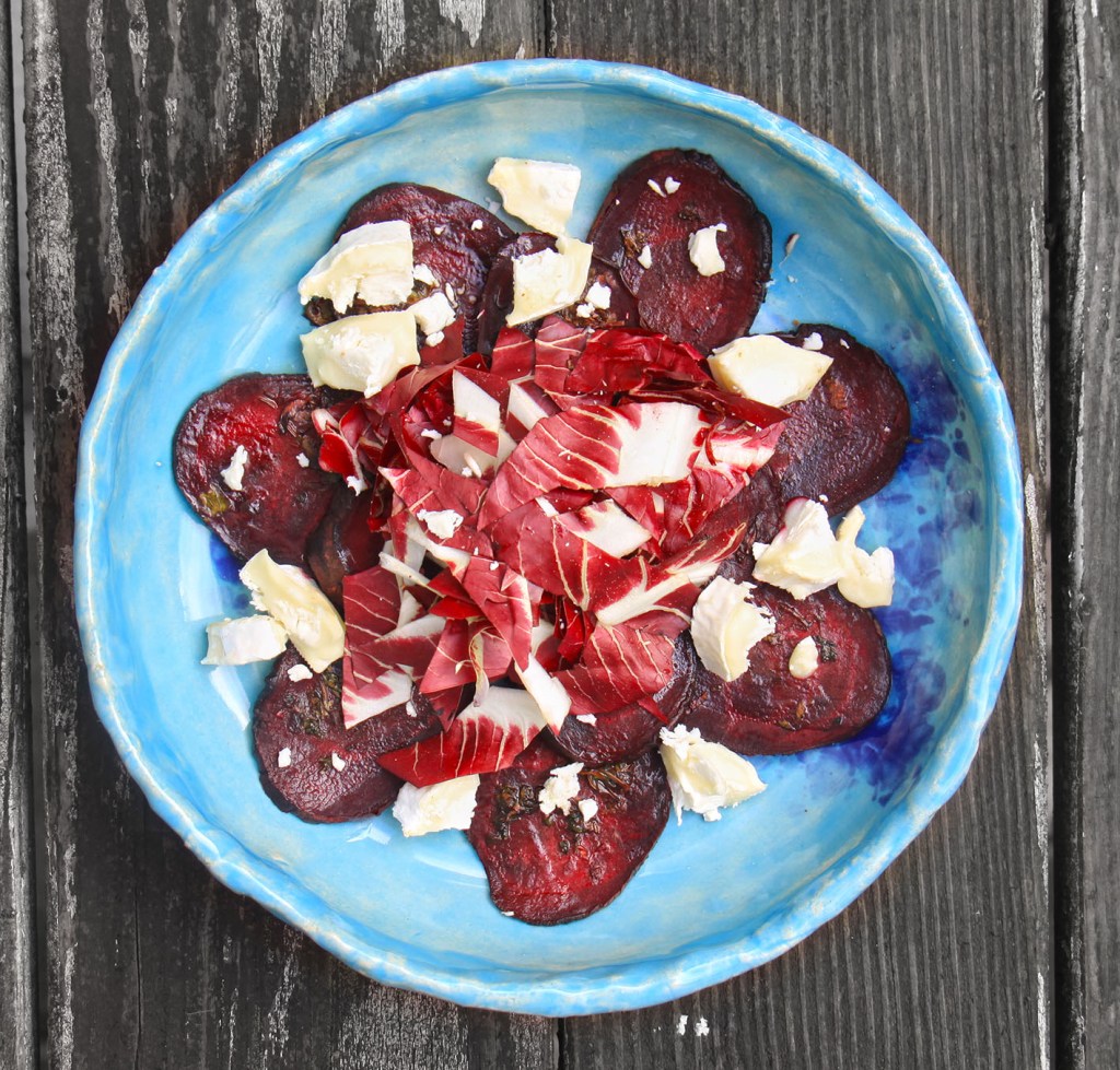 pro Person eine Rote Bete im Backofen bei 180° ca. 35 Minuten garen, dann schälen und ca. 3mm dünn aufschneiden. Auf Teller legen. Aus 1EL Granatapfel-Essigcreme und 2 EL Schwarzkümmelöl und 1/4TL Salz ein Dressing anrühren. Pro Person 50g etwas gereiften Ziegenfrischkäse (z.B. Rolle oder Ziegenfeta) in kleine Stücke schneiden oder brechen und auf der Bete verteilen. Pro Person 2–3 Blätter Trevisiano waschen und schneiden und mittig auf der Bete anrichten. Das Dressing darüber verteilen. Fertig. Lecker!