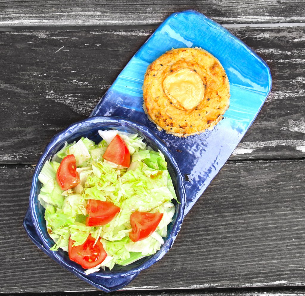 Einen Knollensellerie gut waschen und bürsten. Den Backofen auf 180° vorheizen und die ganze Knolle (ungeschält) 1,5 Stunden garen. Sellerie etwas abkühlen lassen, schälen und mit einem Kartoffelstampfer zu einem groben Püree verarbeiten. Die Masse mit Salz, Kurkuma, gemahlenem Koriander und Pfeffer abschmecken. 1 Ei und 50g Kräuterfrischkäse dazu geben. In flachen Förmchen portionieren – z.B. 6er Silikon-Bun-Backformen. 100g Ziegenkäserolle in 6 Scheiben schneiden und jeweils eine Scheibe Käse in die Mitte des Pürees drücken. Im Backofen bei 180° ca. 20 Minuten backen. Mit Salat vernaschen.