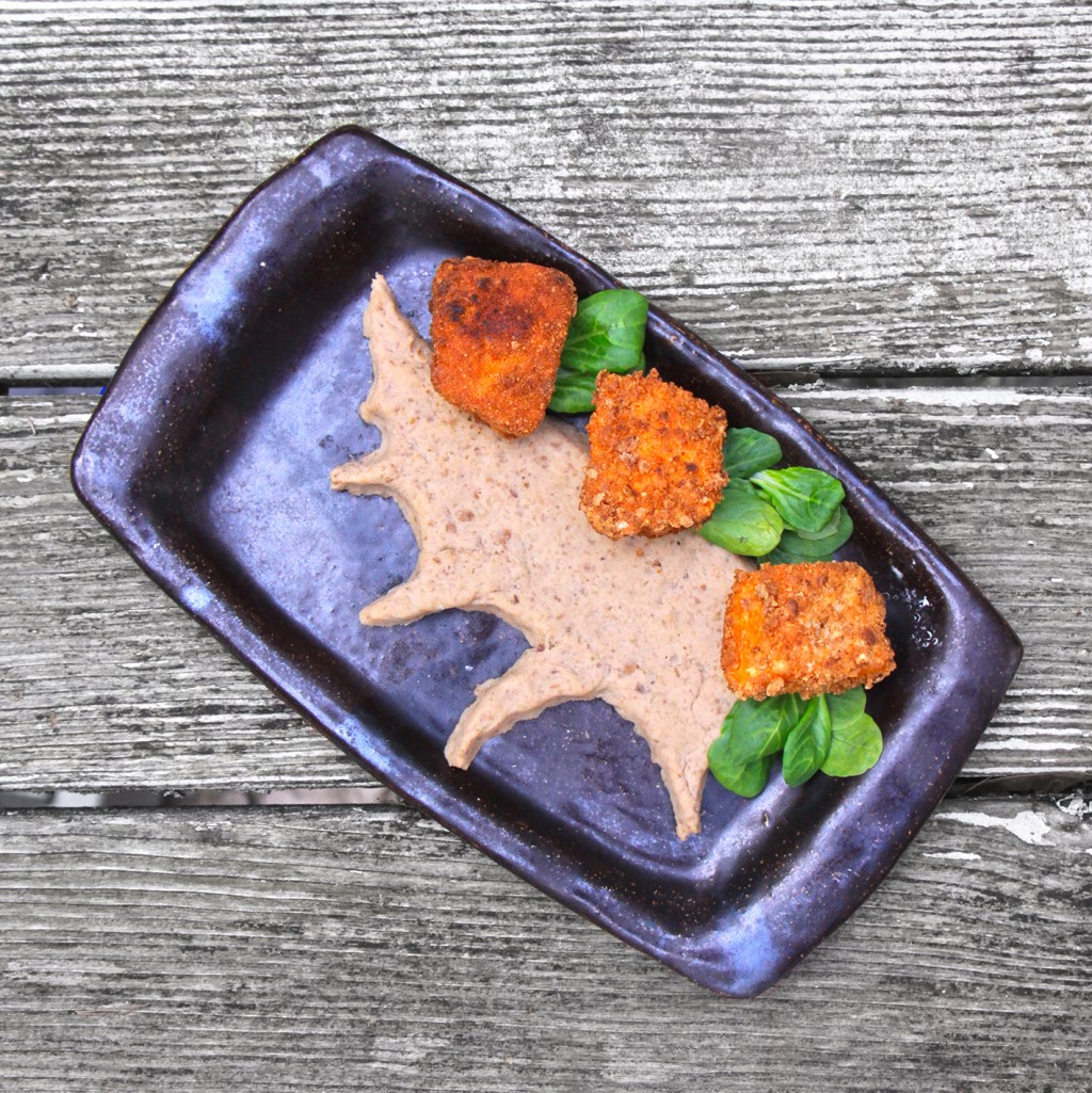Für 2. 1/2 Hokkaido ohne Kerne sowie 2 kleine Kartoffeln im Backofen ca. 20 Minuten vorgaren. Den Kürbis in 6 bis 8 möglichst gerade Stücke schneiden. Diese schälen. In 3 Schüsseln 4 EL Mehl, 1 verquirltes Ei und 6 EL Brösel bereit stellen. Das Mehl mit Salz und 1/2 TLKürbisgwürz würzen. Die Kürbisstücke nacheinander jeweils in Mehl, Ei und Brösel wälzen und in einer Fritteuse oder einem kleinen Topf in reichlich Frittierfett ausbacken. 200g küchenfertige Maronen (geschält, gegart) und die 2 Kartoffeln klein würfeln. In 100ml Kochsahne einmal aufkochen. 25g Butter dazu geben und mit dem Zauberstab pürieren. Mit Salz, Pfeffer und einer Prise Kardamom würzen. Zu Nuggets und Püree einen Feldsalat servieren.