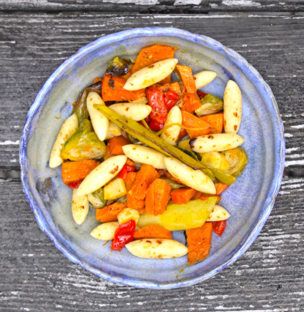 Für 2: 400g Kürbis (z.B. Hokkaido, kann mit Schale verwendet werden) nach Bedarf schälen und in etwas größere Würfel schneiden (ca. 2×2 cm). 2 rote Paprika und 1 Zwiebel fein würfeln. In einer tiefen Pfanne oder einem Wok (mit Deckel) die Zwiebelwürfel in 1 EL Öl anbraten. 1 EL Tomatenmark, Paprika und Kürbiswürfel dazugeben, mit 150ml Gemüsebrühe aufgießen und ca. 15 Minuten mit Deckel schmoren. Dann mit etwas Salz und 1/2 TL Räucherpaprika würzen und ohne Deckel 5 Minuten witerschmoren. Falls noch weitere saisonale Gemüsereste im Kühlschrank schlummern (z.B. Sellerie, Petersilienwurzel o.ä.), könnt ihr das einfach dazu würfeln. Im Bild seht ihr noch etwas Lauch und Rosenkohl. Das „Gulasch“ schmeckt mit Spätzele, Nudeln oder Schupfnudeln – ganz nach Geschmack.