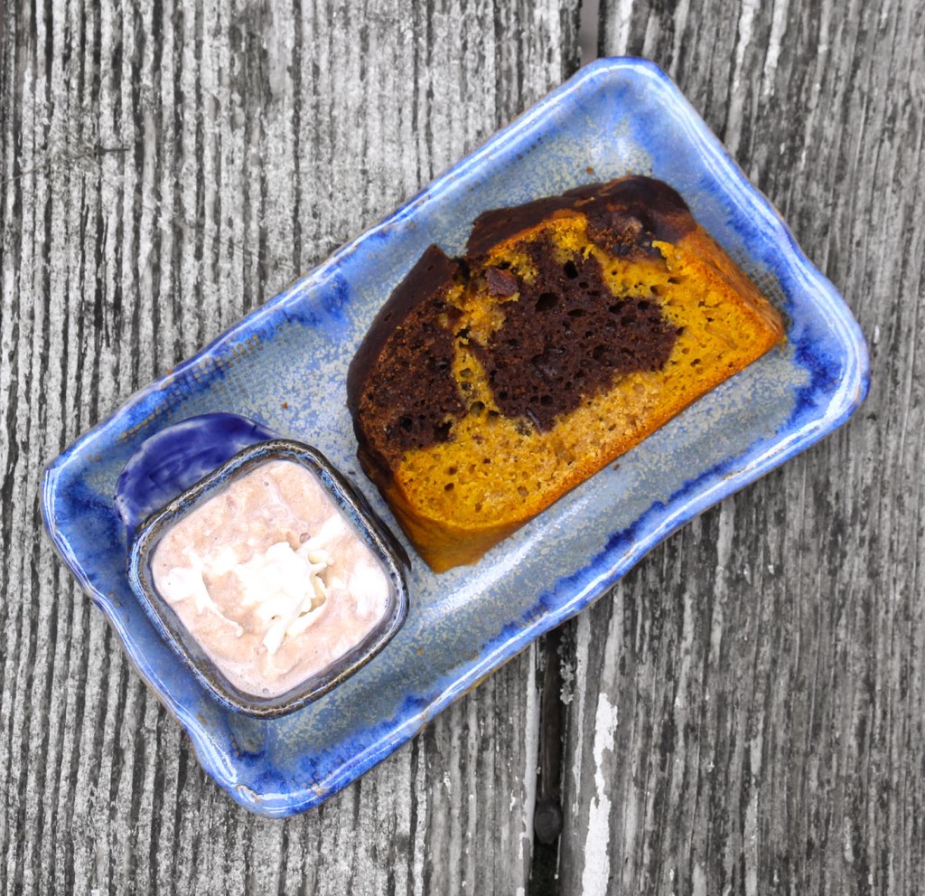 300g Hokkaido-Püree herstellen. Dafür ca. 1/2 kleinen Hokkaido mit Schale ohne Kerne im Backofen bei 180° ca. 15 Minuten garen und dann pürieren. 180g Butter sanft schmelzen. 180g braunen Zucker und 4 Eier (M–L) schaumig rühren. 360g Dinkelmehl, 20g Backpulver sowie je 1 TL Vanille und Zimt sowie die geschmolzene Butter und das Kürbispüree dazu geben und auf mittlerer Stufe weiter rühren. Mit 1 Prise Salz würzen. Eine große Kastenform (11×30 cm) einfetten oder mit Backpapier auslegen und ca. 1/3 des Teiges einfüllen. 3 EL Kakaopulver und einem Schuss Rum (oder Milch) zum restlichen Teig geben und gut verrühren. Den dunklen Teig auf den Hellen geben und mit einem Teigschaber marmorieren. Bei 180° Ober-/Unterhitze ca. 50 Minuten backen.