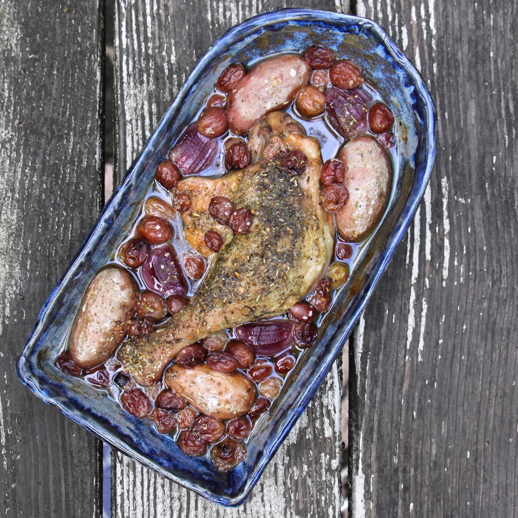 Für 2: 2 Wachholderbeeren und 1 Langpfeffer mörsern. 2 Fasanen-Oberkeulen mit etwas Kräutersalz und den gemörserten Gewürzen einreiben und in eine Auflaufform legen. 250g kernlose Trauben und einige kleine (oder halbierte) rote Kartoffeln und 1 geviertelte rote Zwiebel um die Fleischstücke schichten. 1 EL Öl und etwas grobes Meersalz darüber verteilen und in den Backofen schieben. Bei 160° ca. 30 Minuten schmoren. Dann bei Bedarf den Ofen auf Grill bzw. Oberhitze stellen und das Fleisch noch ca. 5 Minuten anknuspern. Das Gericht schmeckt auch mit anderen kleinen Geflügelkeulen zubereitet werden (z.B. Ente oder Perlhuhn).