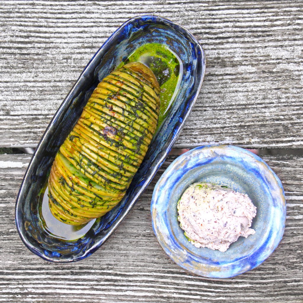 Für 1 große (ca. 300g) festkochende Kartoffel. 50g Salzbutter mit 50g fein gehacktem Schnittlauch mischen. Die Kartoffel gründlich waschen und bürsten. Zwischen 2 Holzlöffel legen und im Abstand von ca. 3mm einschneiden. Dabei darauf achten, nicht durchzuschneiden (dafür die Löffel). In die Zwischenräume die Schnittlauch-Butter verteilen. Im Backofen in einer Auflaufform bei 170° ca. 40 Minuten backen. Dazu schmeckt z.B. Sourcreme oder Räucher-Forellen-Mousse und Salat.