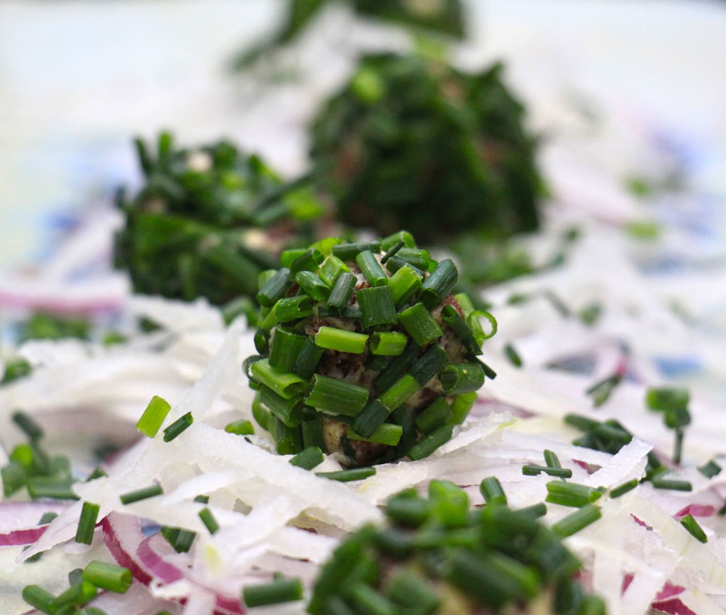 Für 12–15 Kugeln: 80g Pumpernickel klein schneiden oder zerkrümeln und mit 50g weicher Butter und 1/2TL Meersalz mischen. Die Masse ca. 1 Stunde kalt stellen. In dieser Zeit ca. 1 Bund Schnittlauch hacken. Die Pumpernickel-Butter-Mischung zu Kugeln formen und im Schnittlauch wälzen. Fertig! Schmeckt mit Rettichsalat oder frischen Radieschen.