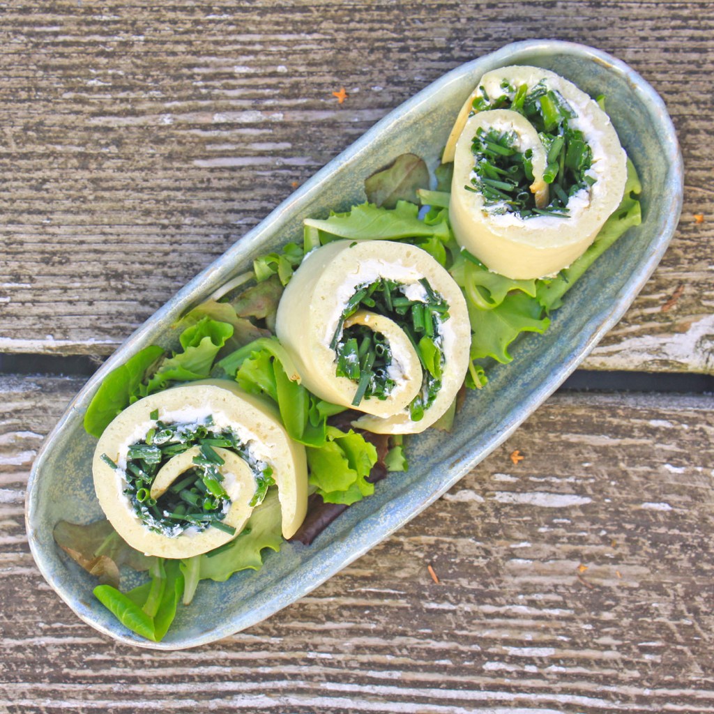 4 Eier trennen. Die Eigelbe mit 1/2 TL Salz und 1TL Zucker schaumig rühren. Eiweiß steif schlagen. 100g Reismehl, je 2 TL Backpulver und Speisestärke mischen und unterheben. Die Eigelbmasse ebenfalls vorsichtig unterheben. Den Backofen auf 160° vorheizen. Den Teig auf Backpapier streichen und ca. 10 Minuten backen. Herausnehmen und gleich auf ein feuchtes Tuch legen. Mit dem Tuch aufrollen und kalt werden lassen. 300g Frischkäse mit 2 Bund gehacktem Schnittlauch mischen und auf den Bisquit streichen . Mit Salz und Pfeffer würzen und wieder aufrollen. Im Kühlschrank gut durchkühlen lassen (dabei fest in Folie wickeln). Dann in ca. 2 cm dicke Scheiben schneiden.