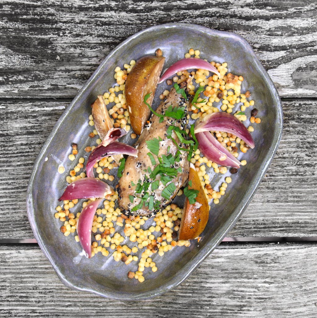 Wild und würzig für 2: 1 große rote Zwiebel und 1 feste Birne in Spalten schneiden. 1El Kaffeebohnen, 1EL Sesam und 1TL grobes Meersalz mörsern und 2 Kaninchenkeulen damit einreiben und ca. 3–4 Stunden ziehen lassen. In einen Schmortopf (mit Deckel) die Birnen und Zwiebelstücke legen. Die Kaninchenteile darauf legen und mit 1 Schuss Kaffeelikör (z.B. 43Baristo) und 50ml Sahne begießen. Den Deckel schließen und im Backofen bei 100° ca. 70 Minuten garen. Mit 2EL gehacktem Selleriegrün bestreuen und mit Weißbrot oder Nudeln servieren. Im Bild „Fregola tostata“ (Hartweizengrieß-Kügelchen, geröstet).