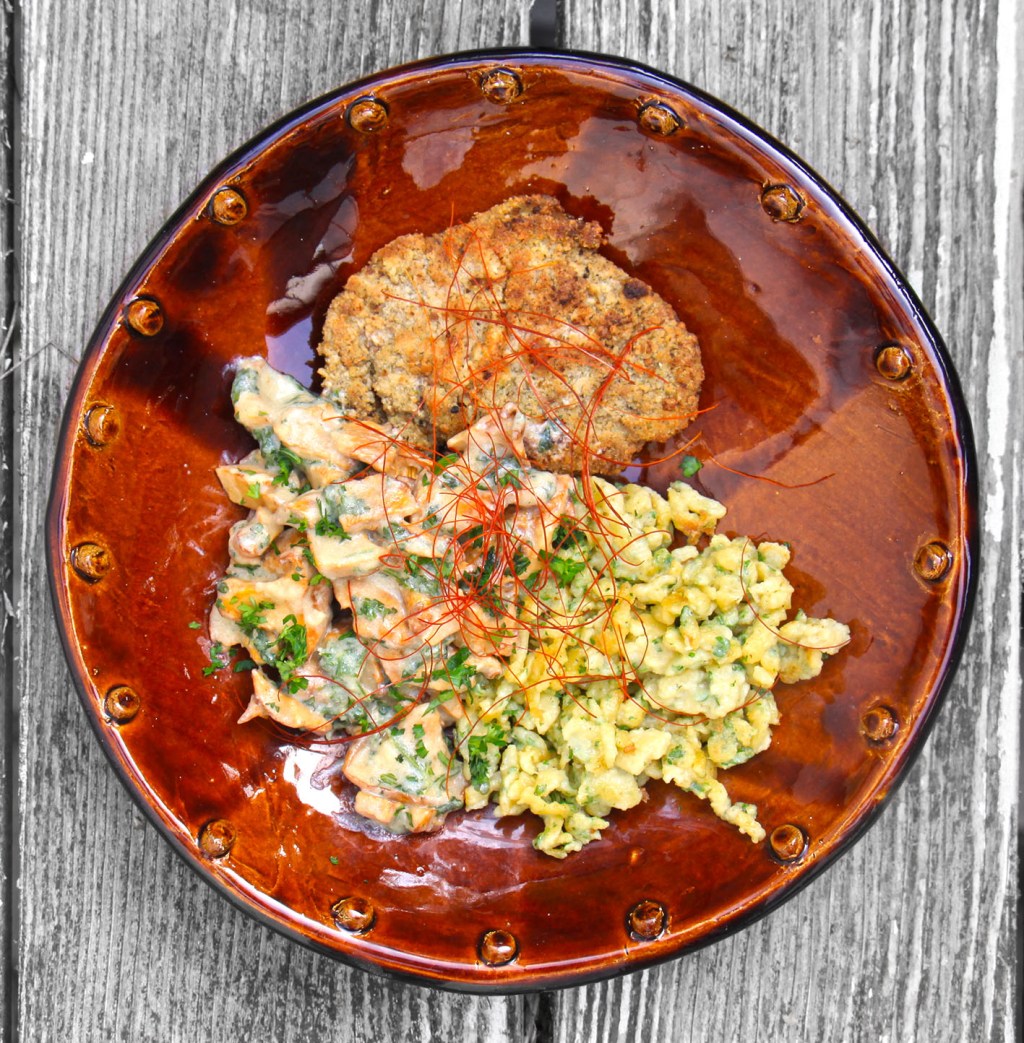 Für 2 Schnitzelfreunde. 200g Pfifferlinge putzen. 3EL Petersilie hacken und 1/2 Zwiebel fein würfeln. 1EL Butterschmalz erhitzen, die Zwiebel glasig braten und die Pilze dazugeben und nach 5 Minuten mit 100ml Kochsahne ablöschen. Die gehackte Petersilie untermischen. Die Brösel für diese Schnitzelvariante mit 1EL getrockneter Petersilie mischen. 2 Kalbsschnitzel panieren (würzen, in Mehl wenden, durch das Ei ziehen und mit den Bröseln gründlich rundherum bedecken). In einer Pfanne Butterschmalz erhitzen und die Schnitzel von jeder Seite ca. 5 Minuten braten. Als Beilage passen Kräuter-Spätzle: 1 Ei, 100g Mehl, 1/4 TL Salz und 1 Schuß Mineralwasser zu einem glatten Teig rühren. 1EL sehr fein gehackte Petersilie und 1/4TL Brotgewürz untermischen und den Teig abgedeckt 15 Minuten ruhen lassen. In einem Topf Wasser mit 1TL Salz zum Kochen bringen und den Teig ins kochende Wasser hobeln (oder schaben). Wenn die Spätzle an die Oberfläche steigen mit einem Schaumlöffel herausnehmen und auf einem Teller ausbreiten. Die Spätzle in der Schnitzelpfanne nochmal kurz anbraten.
