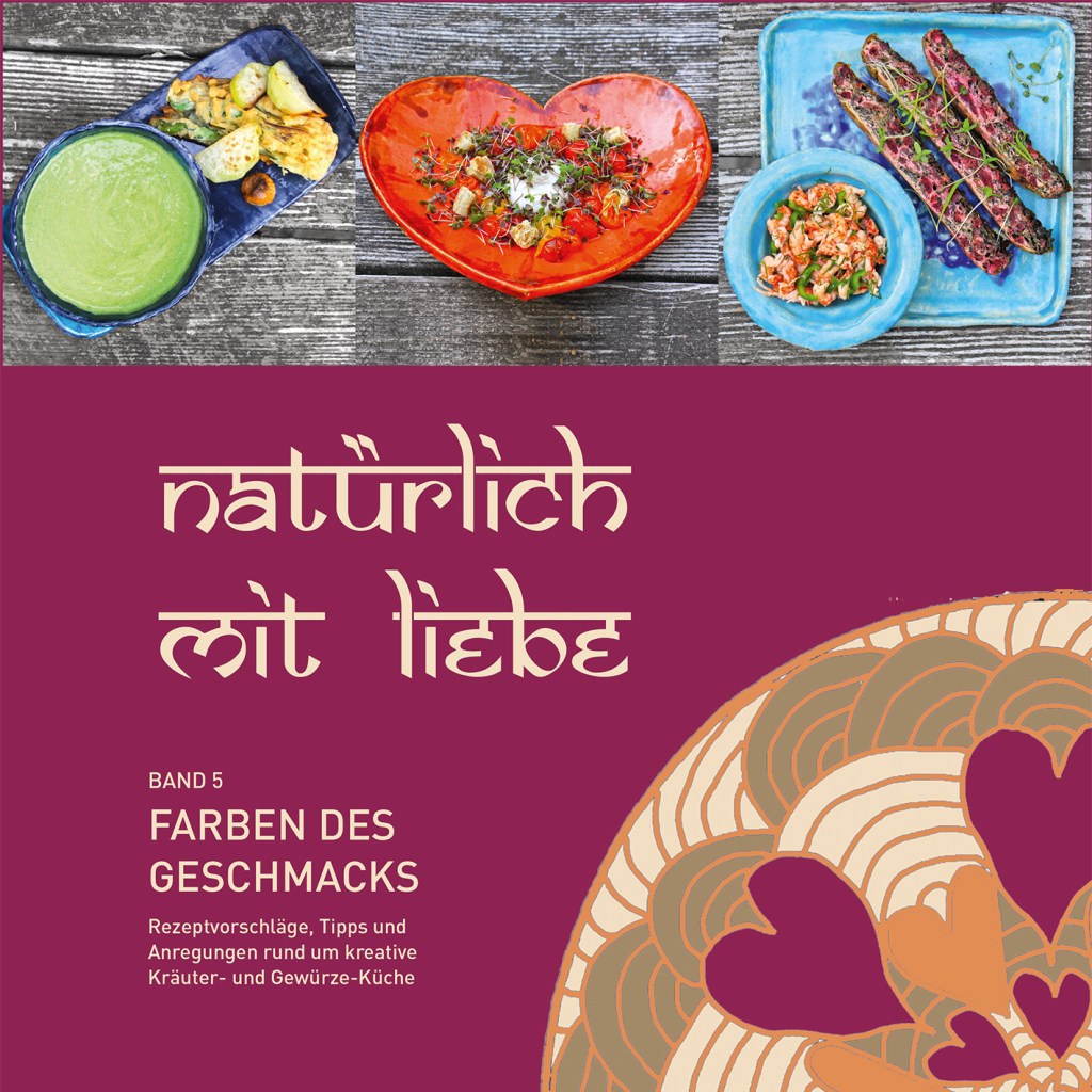 BAND 5 aus der Reihe Natürlich mit Liebe ist fertig: FARBEN DES GESCHMACKS (21×21 cm, Hardcover, 248 Seiten, 40 Euro). Wenn es draußen kälter wird, verlangt der Körper nach mehr „Wärme von Innen“. Da kommen kräftig gewürzte Speisen ins Spiel. Die Kapitel: Suppen – Mit Fisch – Vegetarisch – mit Fleisch – Tartes&Co – Süßes