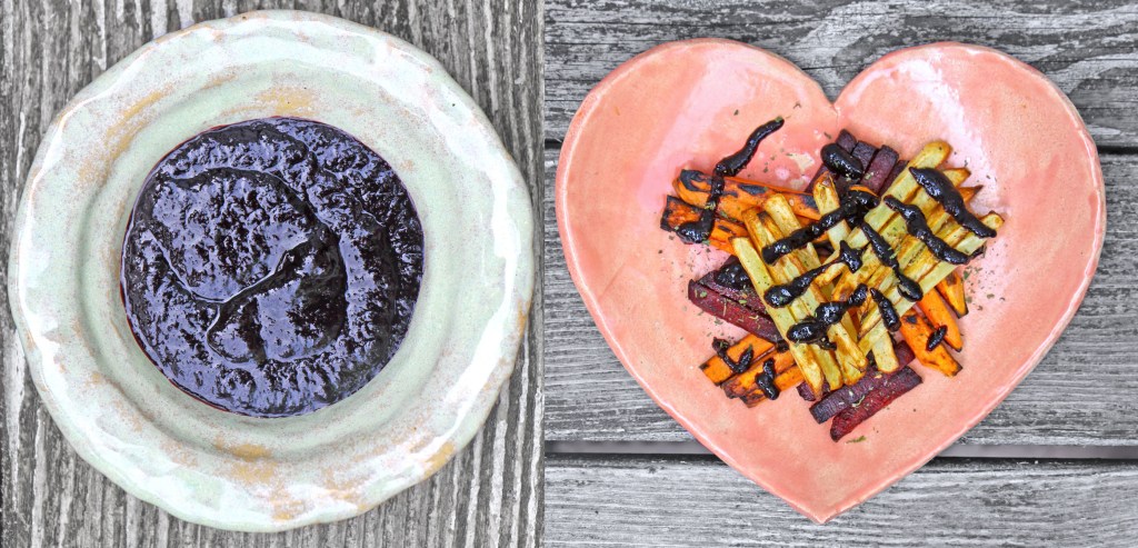 Vom Feldspaziergang oder aus dem Garten: 400g reife Holunderbeeren in einen mittelgroßen Topf geben. 1 grünen Apfel (ca. 120g, sauer, nicht ganz reif) und 5 getrocknete Tomaten klein schneiden und mit den Beeren mischen. Je 100ml Holundersirup und Sherry dazu geben und das Obst ca. 30 Minuten köcheln. Mit 1 Tropfen Hickory Rauch und 1 TL Salz oder 1 TL geräuchertem Meersalz würzen. Auf der Herdplatte abkühlen lassen, pürieren und durch ein nicht zu feines Sieb passieren (um die Kernchen vom Holunder zu entfernen). Im Topf ca. 5–10 Minuten auf die gewünschte Konsistenz einkochen und heiß in ein Schraubglas abfüllen. Schmeckt zu Burger, Pommes oder leckeren Ofen-Wurzel-Sticks (im Bild Süsskartoffel, Bete und Sellerie).