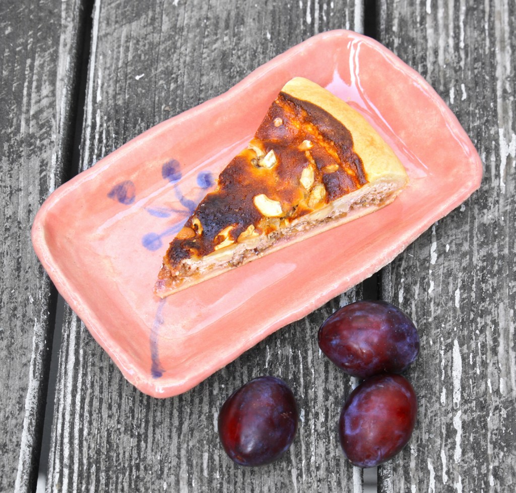 für eine Tarteform ø28-30cm: Süßen Mürbeteig zubereiten – oder fertigen aus dem Kühlregal verwenden (z.B. von TanteFanny). Für den Teig. 175g weiche Butter und 100g Zucker schaumig schlagen. 1 Ei, 300g Mehl und 1 Prise Salz mit den Knethaken unterrühren. Den Teig zu einer Kugel formen in Klarsichtfolie einwickeln und für 30 Minuten kühl stellen. Dann Ausrollen und in eine gefettete Tarteform legen. Den Backofen auf 160° (Unterhitze) vorheizen. Für den Belag: 250g Zwetschgen entsteinen und mit 3EL Kokosblütenzucker pürieren. 3 Eier mit 100g Zucker schaumig schlagen, 300g Doppelrahm-Frischkäse und 1TL Backpulver unterheben. Die Käse-Ei-Masse auf dem Tarteboden verteilen und das Zwetschgenpüree mit einem Eßlöffel hineinklecksen. Mit gehackten Nüssen bestreuen und ca. 40 Minuten im unteren Drittel des Backofens backen.