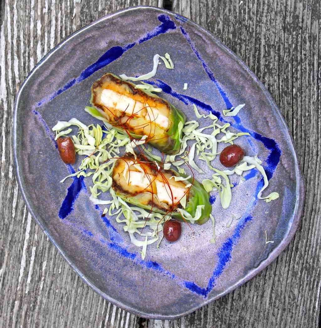 Sommerliches Dinner für Zwei: 6 große Spitzkohlblätter vorsichtig ablösen und in kochendem Salzwasser für 2 Minuten kochen. Anschließend eiskalt abspülen, gut trocken tupfen und unter einem schweren Topf plattieren. Evt. dicke Blattrippen flach abschneiden. 2 Kartofffeln (ca. 400g) im Backofen bei 200° ca. 30 Minuten backen bis sie weich sind. Dann stampfen und mit Salz und einem Spritzer Zitronensaft würzen. Jeweils 3 Blätter zu einem Rechteck leicht überlappend zusammen legen. 200g dunkle Oliven (ohne Stein) pürieren, den Spitzkohl damit bestreichen. 200g Haloumi in ca. 5 cm lange Sticks (Kanten jeweils 1 cm) schneiden und in einer Pfanne schön kross braten. Die gestampften Kartoffel auf die Olivenpaste streichen, die Käsesticks (längs) in die Mitte legen und zu einer festen Rolle aufrollen. Die beiden Rollen in jeweils 6 Stücke schneiden und sofort (lauwarm) vernaschen. Oder vorbereiten und kurz vor dem Servieren nochmal im Ofen mit Grillfunktion erwärmen.