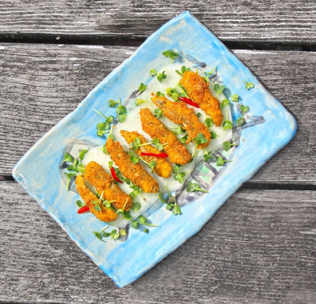 Leicht und herzhaft für 2: 1/2 kleine Honigmelone in dünne Scheiben schneiden. 1 Frühlingszwiebel und 1 kleine rote Chili (ohne Kerne) fein hacken. 1 EL Limette und 2 EL Olivenöl mit dem feingehacktem Gemüse mischen und die Melonenscheiben darin marinieren. Eine kleine Panierstrasse vorbereiten. Auf 3 kleine etwas tiefere Teller 3 EL Mehl, 3 EL Brösel und 1 Eigelb geben. 14 Sardellenfilets (wenn Sie in Öl eingelegt waren zunächst auf Küchenpapier etwas abtropfen) nacheinander in Mehl, Eigelb und Brösel wälzen und in einem kleinen Topf schwimmend in Butter ausbacken. Auf dem Melonen-Carpaccio anrichten. Mit Radieschen-Sprossen vernaschen.