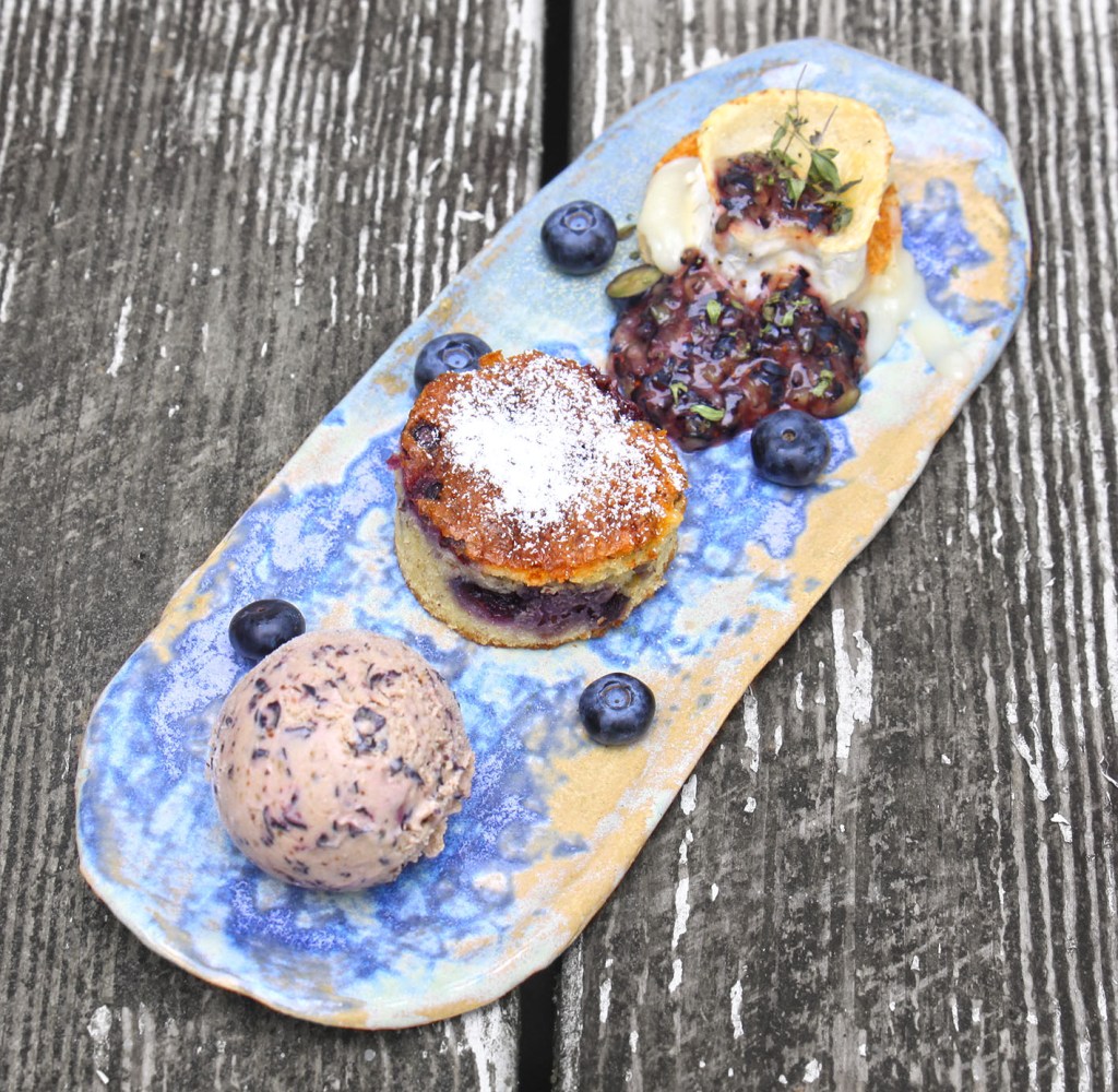 Blaubeer-Eis: 5 Eigelb mit 50ml Sahne, 3 EL Zucker und 1 EL Grandmanier leicht erhitzen. 200ml Sahne mit 250g Blaubeeren in einer Küchenmaschine pürieren. Mit der Ei-Sahne-Masse mischen und für 1 Stunde in die Eismaschine geben (rühren und gefrieren).