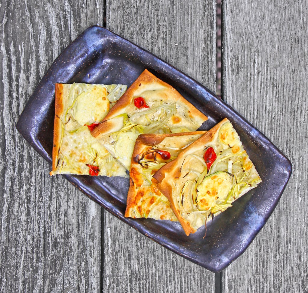 Als Snack für Viele oder für 2 als Mahlzeit: 1 Rolle Flammkuchenteig aus dem Kühlregal (z.B. Tante Fanny) auf einem Backblech mit Backpapier ausrollen. Mit 50g Frischkäse bestreichen. Backofen mit Unterhitze auf 180° vorheizen. 1 Fenchel fein hobeln und eine kleine Zucchini mit einem Julienne-Hobel in feine Streifen schneiden. Das Gemüse mit weissem Pfeffer, 1 gehackten Knoblauchzehe und Salz und einigen roten Minipaprika (Sweet Drops) würzen. 200g Ziegenfeta mit 2 Eiern verquirlen und die Käsemasse mit einem Teelöffel auf dem Gemüse verteilen. 10–15 Minuten backen.