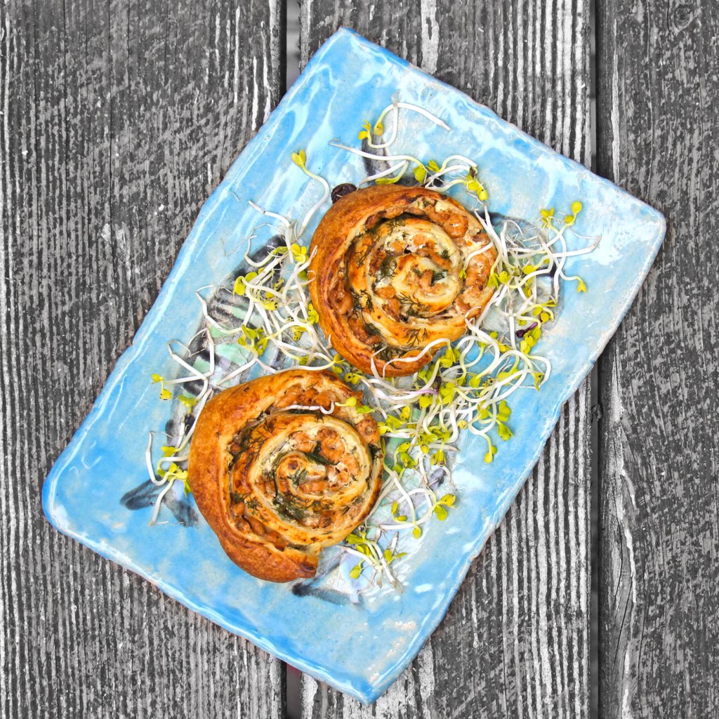 Für 2 mit Salat als Hauptgericht – oder für 4–6 als Vorspeise. 1 Rolle Dinkel-Blätterteig aus dem Kühlregal (z. B. Tante Fanny) ausbreiten und mit 100g Kräuter-Frischkäse bestreichen. 200g Nordseekrabben darauf verteilen. 3–4 Zweige Dill zupfen und die Dillspitzen auf die Krabben streuen. Die Teigplatte von der kurzen Seit locker aufrollen und in 2–3 cm dicke Scheiben schneiden. Diese auf einem Backblech mit Backpapier leicht flach drücken und ca. 15 Minuten bei 160° (Umluft) backen.