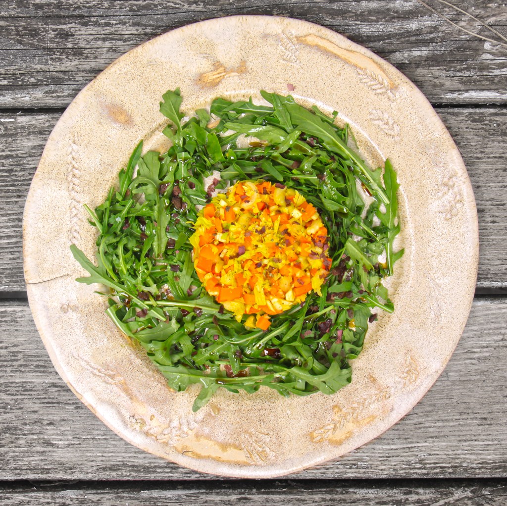 Für 2 Portionen: 1/4 eines mittleren Hokkaido im Backofen ca. 10 Minuten bei 150° garen. Abkühlen lassen. 2–3 zarte Stangen Staudensellerie (aus der Mitte) und das Kürbisviertel klein würfeln. 1 Limette auspressen. Das Gemüse mit dem Limettensaft, etwas frisch gemörsertem Pfeffer und 1 TL Dulse-Flakes (Rotalgen) gut mischen. Das Tatar auf Rucola anrichten und nach Geschmack die Blätter noch mit Limette und etwas Kürbiskernöl beträufeln.