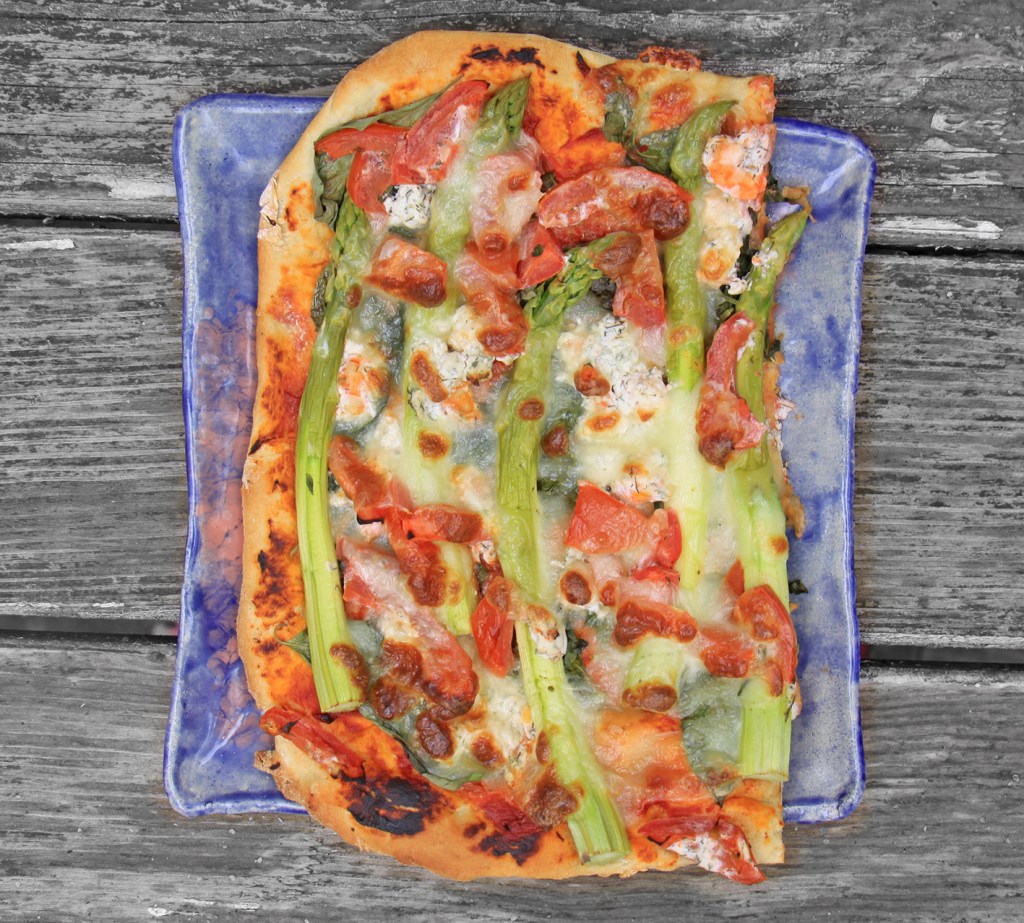 1 Würfel frische Hefe in eine Schüssel krümeln. 1/2 TL Zucker, 2 TL Salz und ca. 75ml lauwarmes Wasser dazu geben und die Hefe glatt rühren. 300g Pizzamehl (enthält ca. 1/3 Gries) und 2 EL Öl in die Schüssel geben und alle zunächst mit einem Holzlöffel, dann mit der Hand verkneten. Falls der Teig zu klebrig ist, noch etwas Mehl dazu geben. Abgedeckt an einem warmen Ort (z.B. unter der Bettdecke) ca. 1,5 Std. gehen lassen. Ein Backblech mit Backpapier auslegen. Den Backofen auf 200° vorheizen. Den Teig mit den Händen auf die Größe des Blechs ziehen. 3 EL Tomatenmark auf den Teig streichen. 1 Bund Basilikum hacken und darauf verteilen. Von 500g grünem Spargel die unteren 1–2 cm abschneiden und ggf. im unteren Teil schälen. (je nach dicke der Stangen). 1 Fleischtomate (ohne Saft und Kerne) würfeln und auf dem Spargel verteilen. 200g Mozzarella gerieben oder in dünnen Scheiben darauf geben und 15–20 Minuten backen.