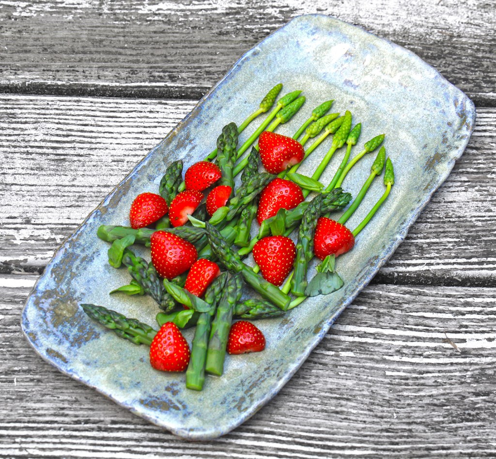 Sommerliches Lunch für 2: 100g Erdbeeren waschen und je nach Größe halbieren oder in Viertel schneiden. 200g Wildspargel und 300g Spargelspitzen (Grün oder Weiß) in 1 EL Butter und 2 EL Wasser 1 bis 2 Minuten dünsten. Für das Dressing: 5 grüne Urwaldpfefferkörner mörsern. 1 Limette auspressen. 1 TL Salz, den Pfeffer und den Limettensaft mit 3 EL Granatapfelkernöl (z.B. Ölmühle Solling) oder Aprikosenkernöl zu einem sämigen Dressing rühren. Den Spargel und die Erbeeren mit dem Dressing mischen und mit einigen Blättern gehackten Basilikum bestreut vernaschen.