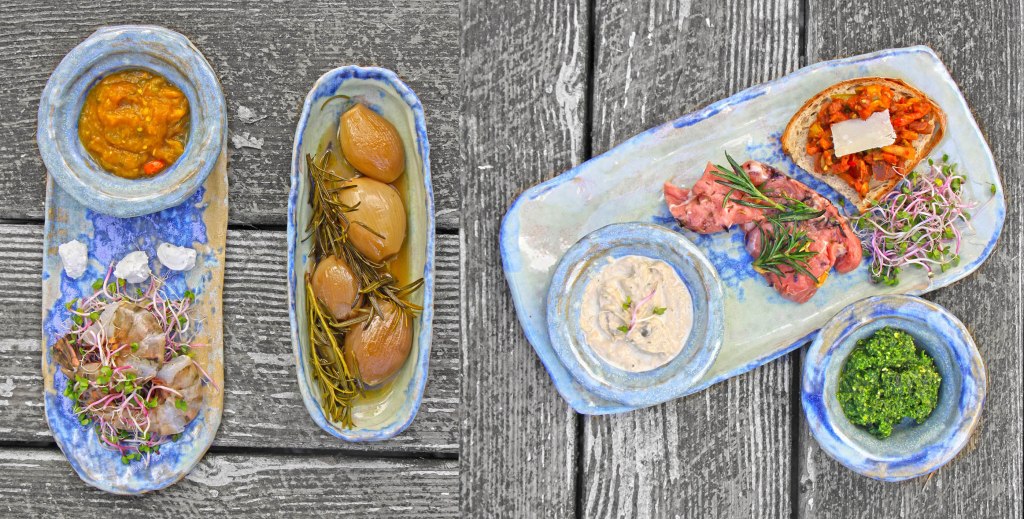Für 4: Kalbs-Filet – Thunfisch-Soße – Rucola-Pesto – Rosmarin-PinotGris-Zwiebeln – Meersalz-Kartoffeln – Tomaten-Bruschetta – Garnelen – Mango-Limoncello-Sosse. Die Sossen vorbereiten und dann Brot, Fleisch und Fisch gemeinsam auf einer Teppanyaki-Platte zubereiten.