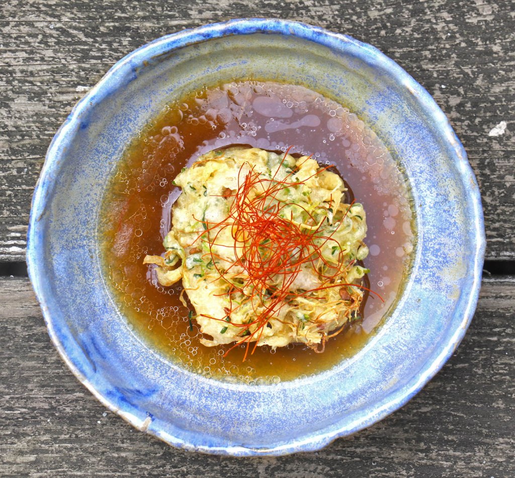 Für 2 Portionen: 1 Gebinde Suppengemüse würfeln (1/2 Stange Lauch, 1/4 Sellerieknolle und 2 Möhren) sowie 1 Zwiebel und 1 Petersilienwurzel in 2 EL Sesamöl in einem Topf anbraten. Mit Wasser komplett bedecken. 1 Langpfeffer, 1 daumengroßes Stück Ingwer, 2 Knoblauchzehen, 3–4 getrocknete Shitake-Pilze und 5 Wacholderbeeren zugeben. Alles einmal aufkochen lassen und dann ca. 1 Stunden sanft weiter köcheln. Einmal vollständig abkühlen lassen und dann nochmals aufkochen und die Brühe durch ein feines Sieb abseihen. Die Brühe mit 1 EL Miso-Paste (z. B. Reismiso von Schwarzwald-Miso) und etwas Salz abschmecken. 150g Tempurateigmischung aus dem Asialaden (nach Packungsanweisung) mit 175 ml eiskaltem Wasser schnell verrühren. 1 Sprossenglas gemischte Sprossen (z. B. Vitalmix) ernten und portionsweise durch den Teig ziehen und anschließend in heissem Kokosöl goldbraun ausbacken. Auf Küchenkrepp abtropfen und salzen. Wer mag, streut noch frischen Koriander oder Chilifäden darüber.
