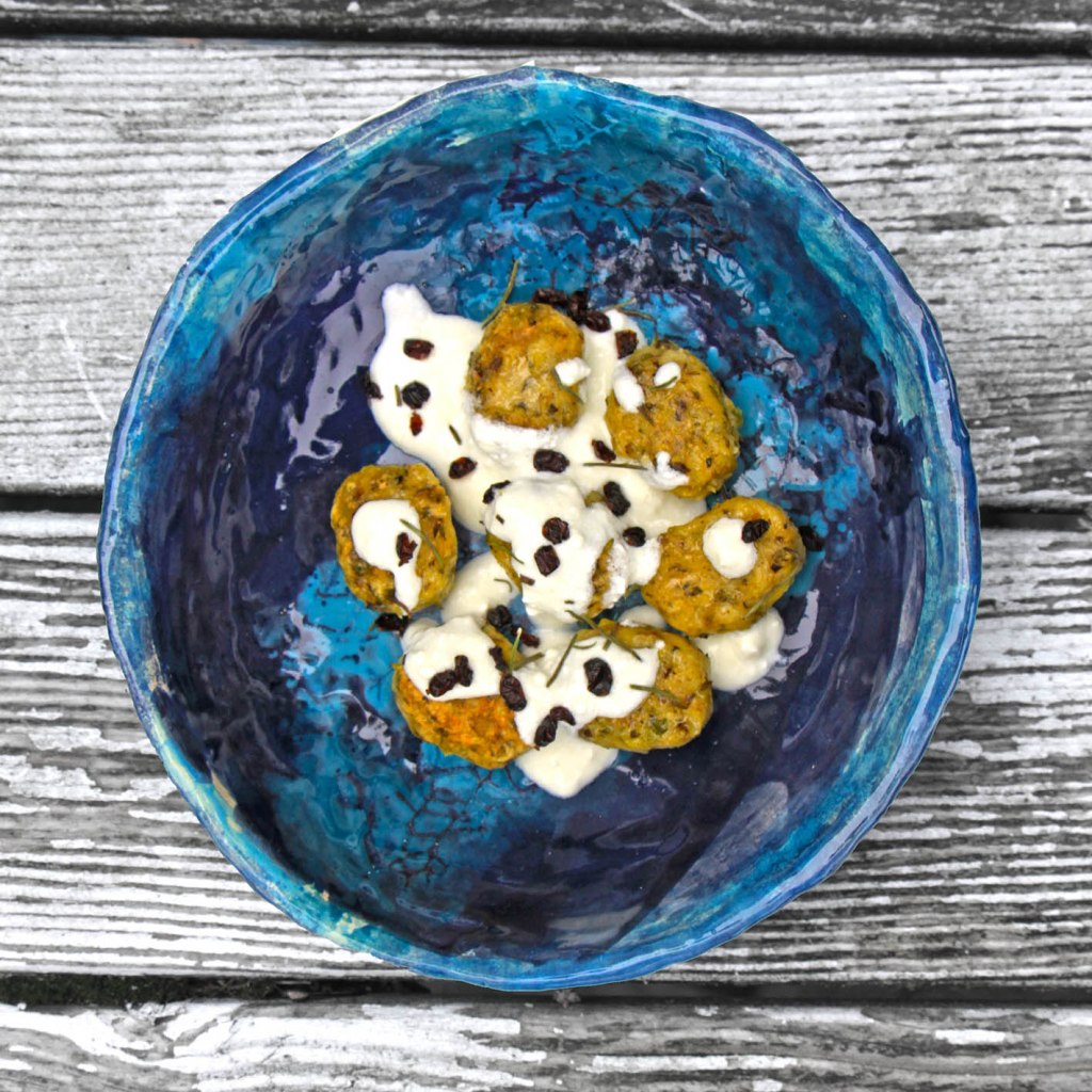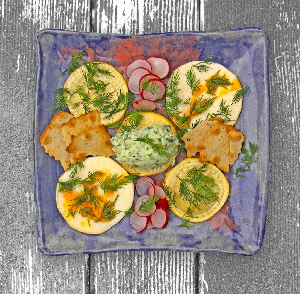 Für 2 Portionen: 1 Butterrübe (ganz und ungeschält) im Backofen ca. 15 Minuten bei 150° garen. Dann schälen und in feine Scheiben schneiden. Aus dem Saft 1 Zitrone, 1/2 TL Salz und 2 EL Leinöl mit Sanddorn ein Dressing mixen. Die Rübenscheiben auf 2 Teller verteilen und mit dem Dressing bedecken. Für die Räucherfischcreme 100g Frischkäse und 100g geräucherten hellen Fisch (Forelle, Heilbutt, Aal) ohne Haut zusammen mit 4 großen Sauerampfer-Blättern und 3–4 Zweigen frischem Dill pürieren und 2 große Nocken daraus formen. Diese auf den Rüben anrichten. Mit Dill und Radieschen garnieren und mit knusprig dünnem (Knäcke)Brot vernaschen.