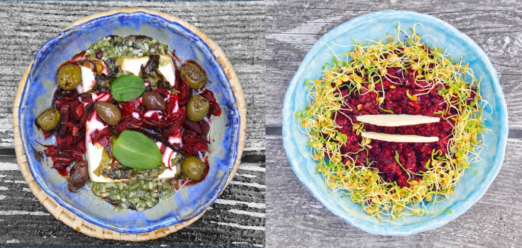 Für 2 Portionen: 2 Knoblauchzehen, 1 grüne Chilischote (ohne Kerne) und 2 Blatt Sauerampfer fein hacken und alles gut mischen. 2 Scheiben Ziegen-Feta (jeweils ca. 150g) von beiden Seiten in die Kräuter drücken. 10 Oliven halbieren und 1 Rote Bete in feine Streifen (Julienne) hobeln oder schneiden. Den Backofen (mit Grill oder Oberhitze) auf 200° vorheizen. Die Käsescheiben in ofenfeste Formen legen mit den Oliven und der Roten Bete bedecken und mit etwas grobem Meersalz bestreuen. Dann ca. 15 Minuten im Ofen backen. Mit Weißbrot vernaschen.